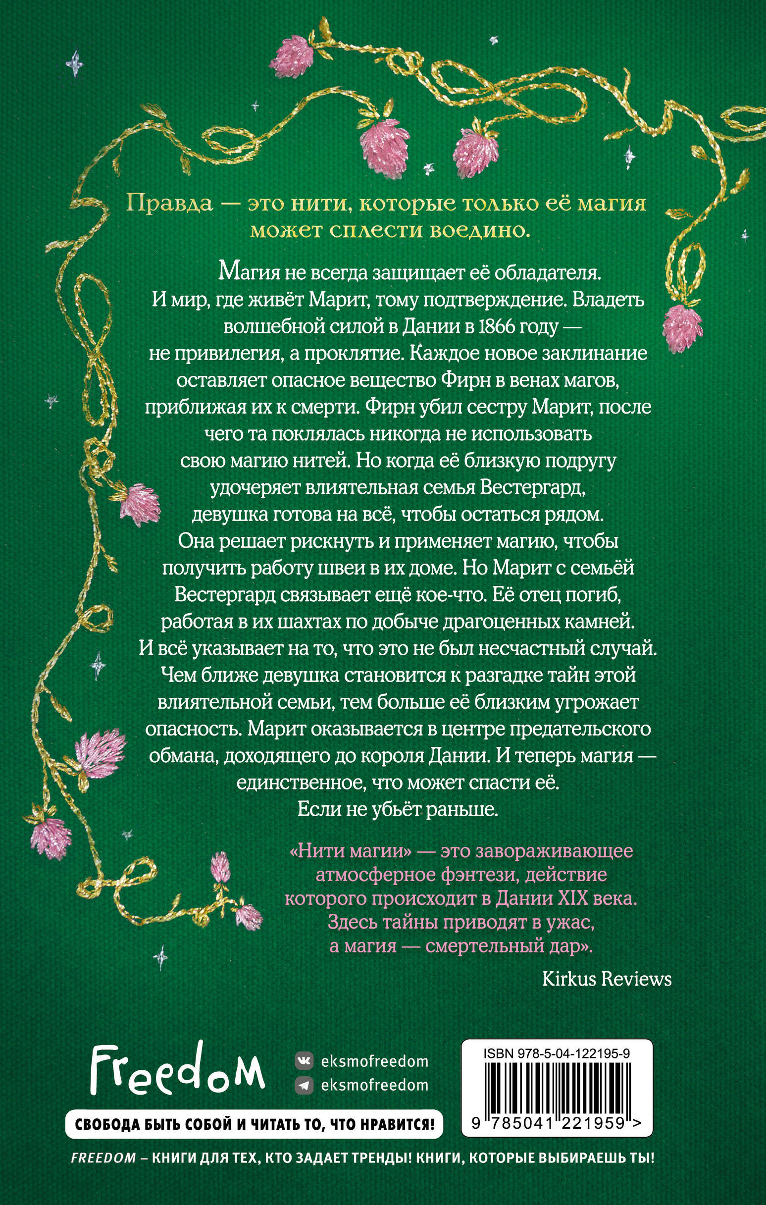Магия не всегда защищает ее обладателя. И мир, где живет Марит, тому подтверждение. Владеть волшебной силой в Дании в 1866 году - не привилегия, а проклятие. Каждое новое заклинание оставляет опасное вещество Фирн в венах магов, приближая их к смерти. Фирн убил сестру Марит, после чего та поклялась никогда не использовать свою магию нитей. Но когда ее близкую подругу удочеряет влиятельная семья Вестергард, девушка готова на все, чтобы остаться рядом. Она решает рискнуть и применяет магию, чтобы получить работу швеи в их доме. Но Марит с семьей Вестергард связывает еще кое-что. Её отец погиб, работая в их шахтах по добыче драгоценных камней. И все указывает на то, что это не был несчастный случай. Чем ближе девушка становится к разгадке тайн этой влиятельной семьи, тем больше ее близким угрожает опасность. Марит оказывается в центре предательского обмана, доходящего до короля Дании. И теперь магия - единственное, что может спасти ее. Если не убьет раньше. «Автор знакомит нас с интересной историей, где храбрая главная героиня сталкивается с тайнами и загадками необъяснимой магии». - Ребекка Росс, автор бестселлера «Восстание королевы»| Издательство | ООО "Издательство "Эксмо" |