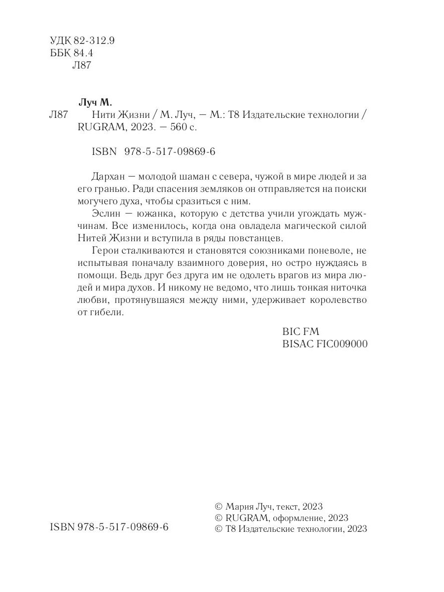 Дархан - молодой шаман с севера, чужой в мире людей и за его гранью. Ради спасения земляков он отправляется на поиски могучего духа, чтобы сразиться с ним. Эслин - южанка, которую с детства учили угождать мужчинам. Все изменилось, когда она овладела магической силой Нитей Жизни и вступила в ряды повстанцев. Герои сталкиваются и становятся союзниками поневоле, не испытывая поначалу взаимного доверия, но остро нуждаясь в помощи. Ведь друг без друга им не одолеть врагов из мира людей и мира духов. И никому не ведомо, что лишь тонкая ниточка любви, протянувшаяся между ними, удерживает королевство от гибели.| Издательство | Т8 RUGRAM |