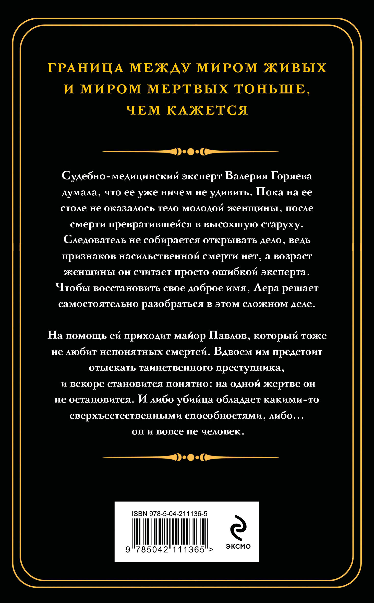 Переиздание от мастера мистического детектива Натальи Тимошенко. Захватывающая история, которая будет держать вас в напряжении от первой до последней страницы. Судебно-медицинский эксперт Валерия Горяева думала, что ее уже ничем не удивить. Пока на ее столе не оказалось тело молодой женщины, после смерти превратившейся в высохшую старуху. Следователь не собирается открывать дело, ведь признаков насильственной смерти нет, а возраст женщины он считает просто ошибкой эксперта. Чтобы восстановить свое доброе имя, Лера решает самостоятельно разобраться в этом сложном деле. На помощь ей приходит майор Павлов, который тоже не любит непонятных смертей. Вдвоем им предстоит отыскать таинственного преступника, и вскоре становится понятно: на одной жертве он не остановится. И либо убийца обладает какими-то сверхъестественными способностями, либо… он и вовсе не человек.| Издательство | ООО "Издательство "Эксмо" |