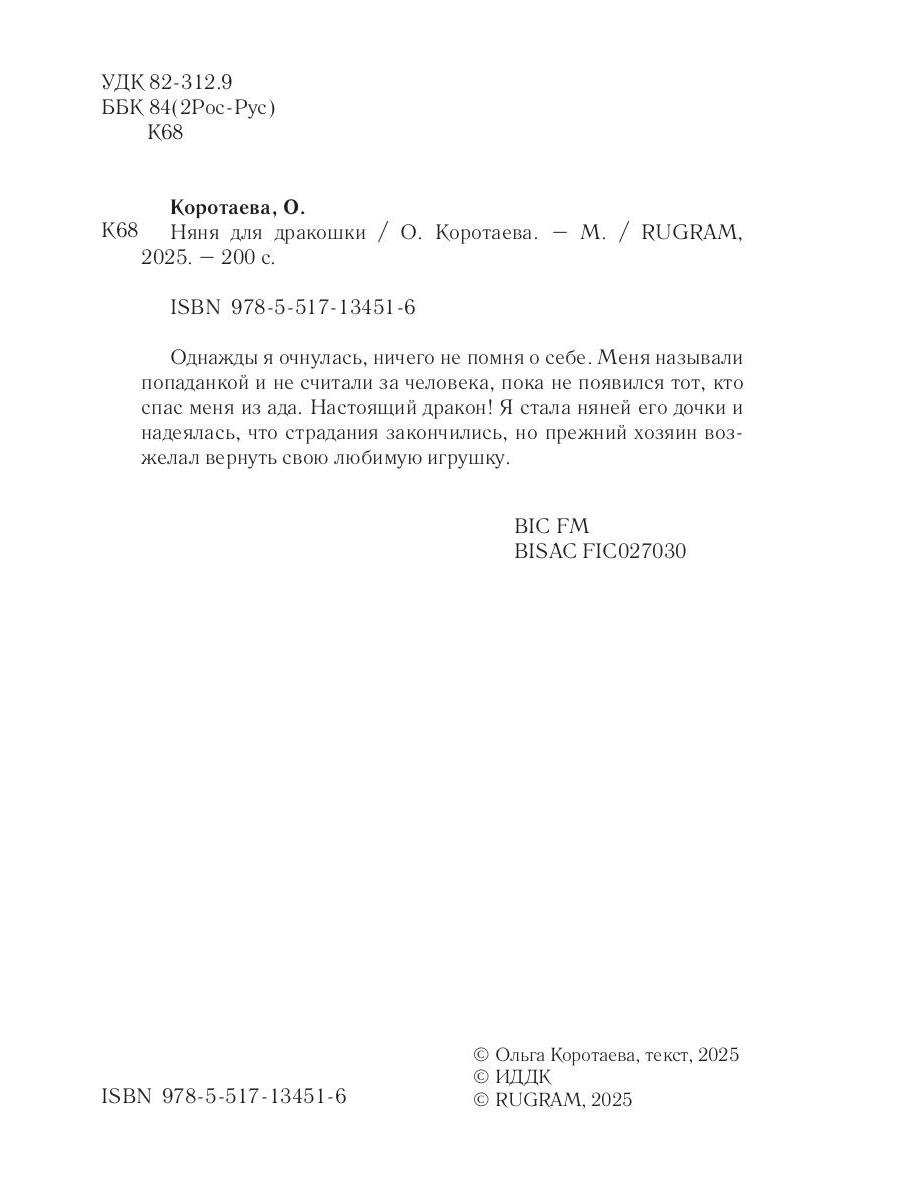 Однажды я очнулась, ничего не помня о себе. Меня называли попаданкой и не считали за человека, пока не появился тот, кто спас меня из ада. Настоящий дракон! Я стала няней его дочки и надеялась, что страдания закончились, но прежний хозяин возжелал вернуть свою любимую игрушку.| Издательство | Т8 RUGRAM |