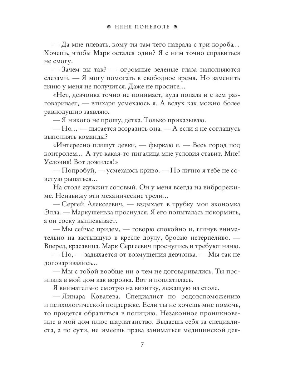 - На няньку час назад наехала машина. Тебе придется ее заменить… - говорю тихо и вкрадчиво. Даже короткая тирада сбивает девчонку с толку. - Любое агентство пришлет вам замену, - робко вставляет она. - Не сомневаюсь, - ухмыляюсь криво. - Но, это займет время. А его у меня нет. Придется отдуваться тебе. Тем более родня, - фыркаю я с издевкой. - Свояченица что ли… - А где моя сестра? - окидывает меня недоверчивым взглядом девица. - Уехала, - бросаю небрежно. - Мы расстались. Она отказалась от ребенка.| Издательство | Т8 RUGRAM |