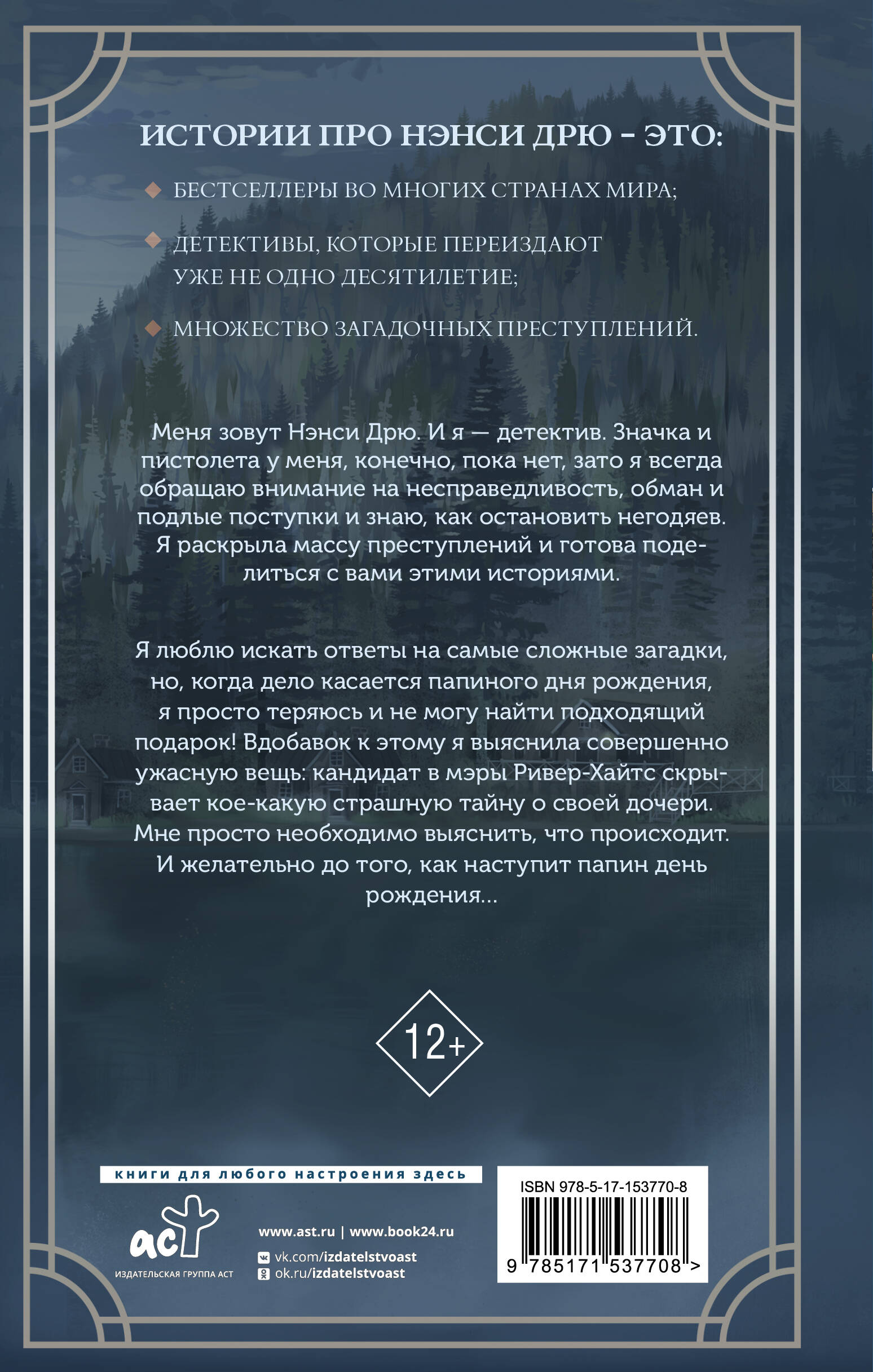 Меня зовут Нэнси Дрю. И я - детектив. Значка и пистолета у меня, конечно, пока нет, зато я всегда обращаю внимание на несправедливость, обман и подлые поступки и знаю, как остановить негодяев. Я раскрыла массу преступлений и готова поделиться с вами этими историями. Я люблю искать ответы на самые сложные загадки, но, когда дело касается папиного дня рождения, я просто теряюсь и не могу найти подходящий подарок! Вдобавок к этому я выяснила совершенно ужасную вещь: кандидат в мэры Ривер-Хайтс скрывает кое-какую страшную тайну о своей дочери. Мне просто необходимо выяснить, что происходит. И желательно до того, как наступит папин день рождения…| Издательство | ИЗДАТЕЛЬСТВО "АСТ" |