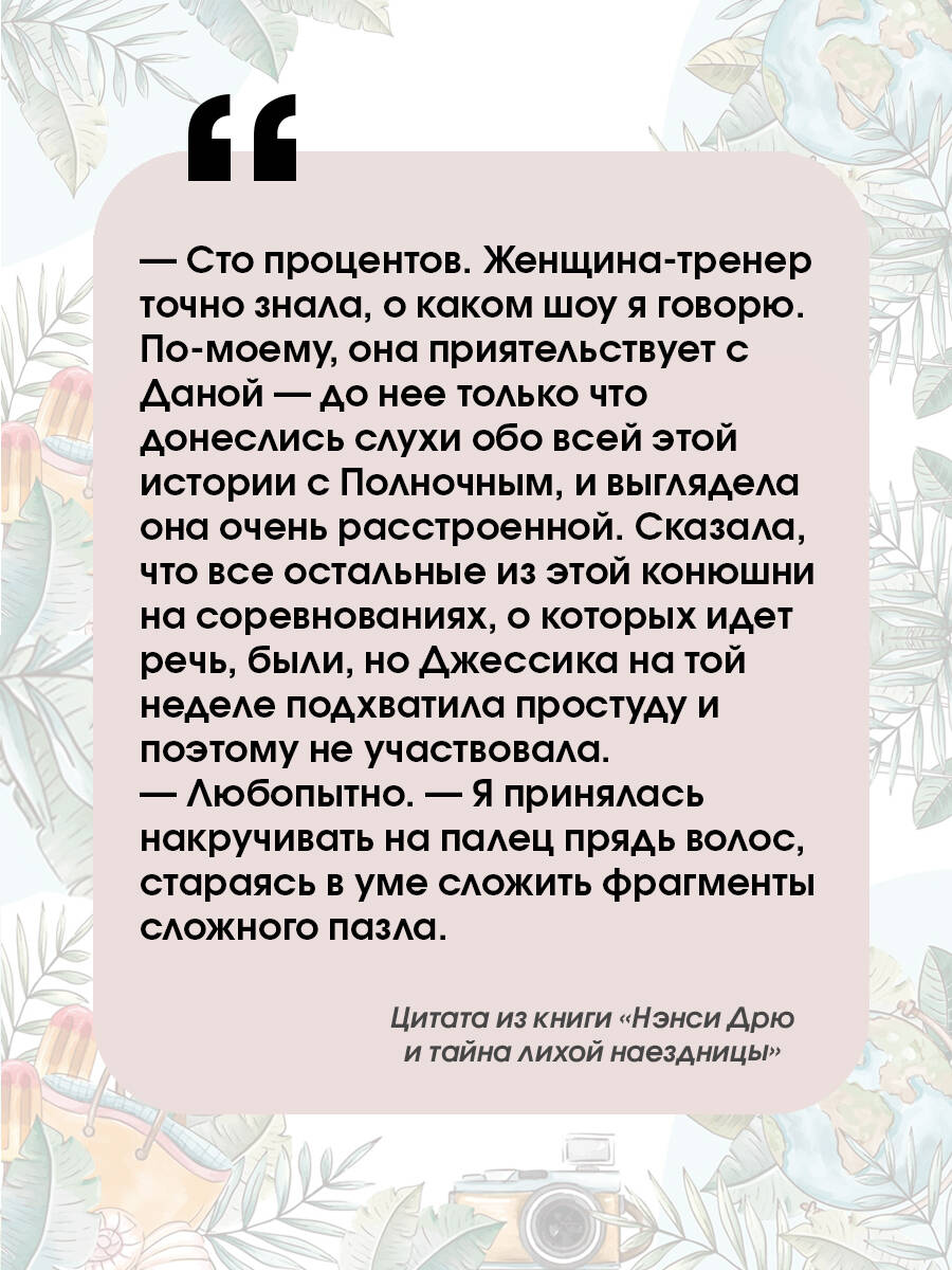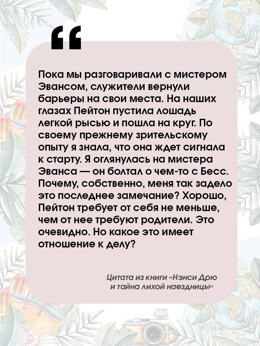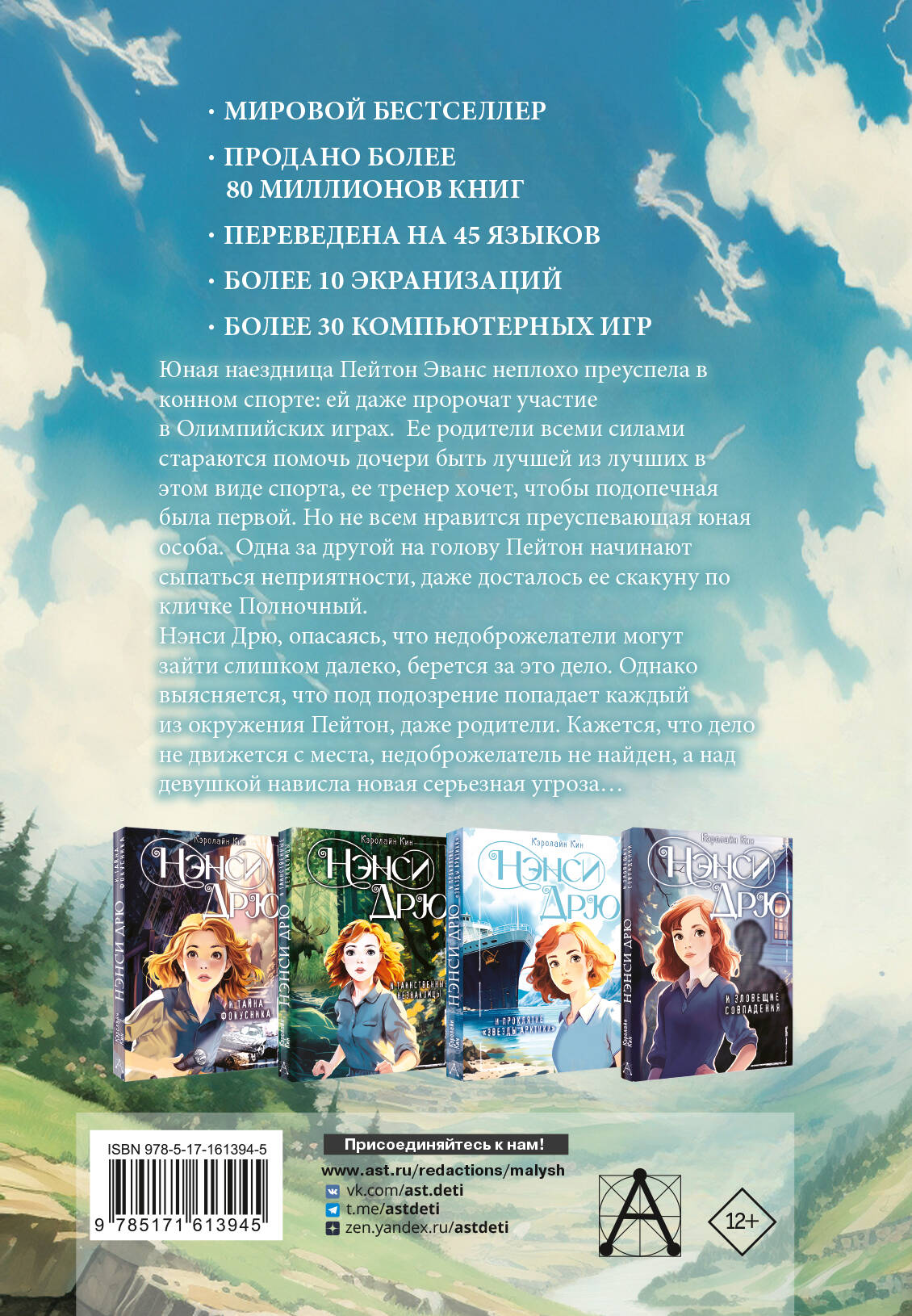Гениальная сыщица Нэнси Дрю вместе с друзьями приезжает на ипподром, чтобы посмотреть конноспортивные выступления. Там она знакомится с шестнадцатилетней наездницей по имени Пейтон Эванс. В свои годы Пейтон добилась многого в конном спорте. Но не все так ладно в жизни этой юной особы: кто-то всевозможными способами пы- тается помешать Пейтон быть лучшей из лучших. Нэнси берется за это непростое дело, а значит, совсем скоро Пейтон сможет вздохнуть пол- ной грудью и продолжит покорять вершины конноспортивного Олим- па. Детективная история из цикла "Дневники Нэнси Дрю". Для среднего школьного возраста.| Издательство | Издательство "АСТ" |