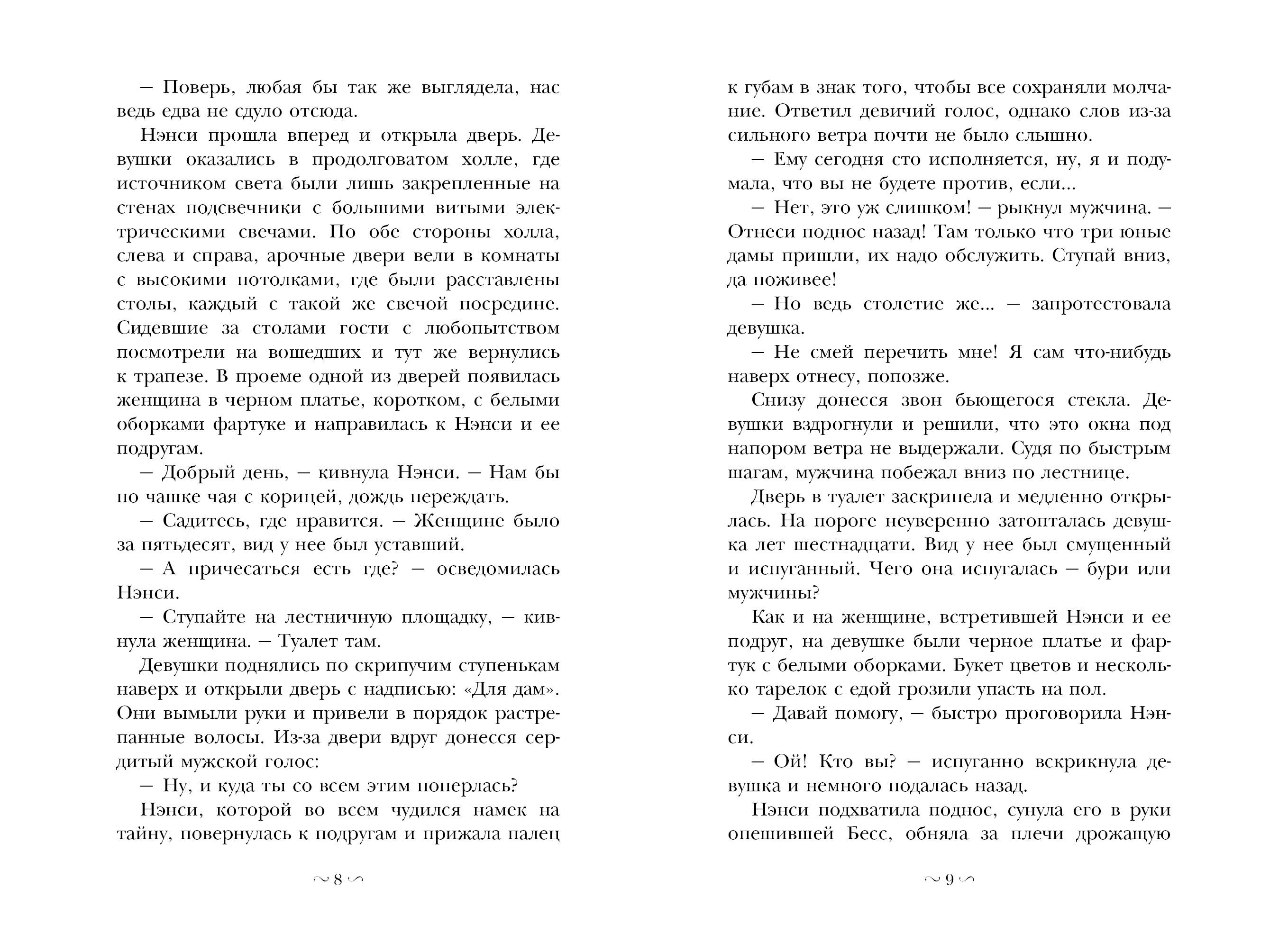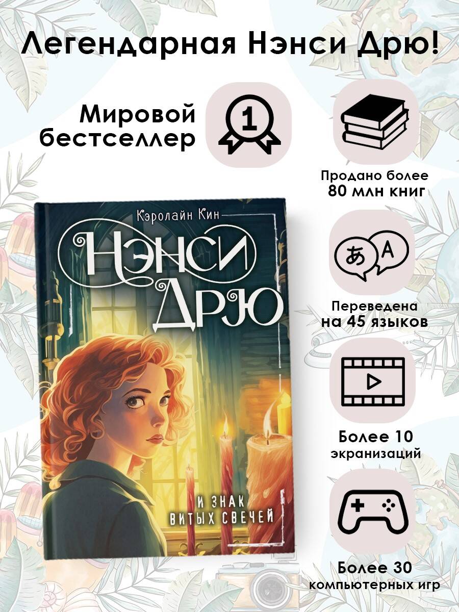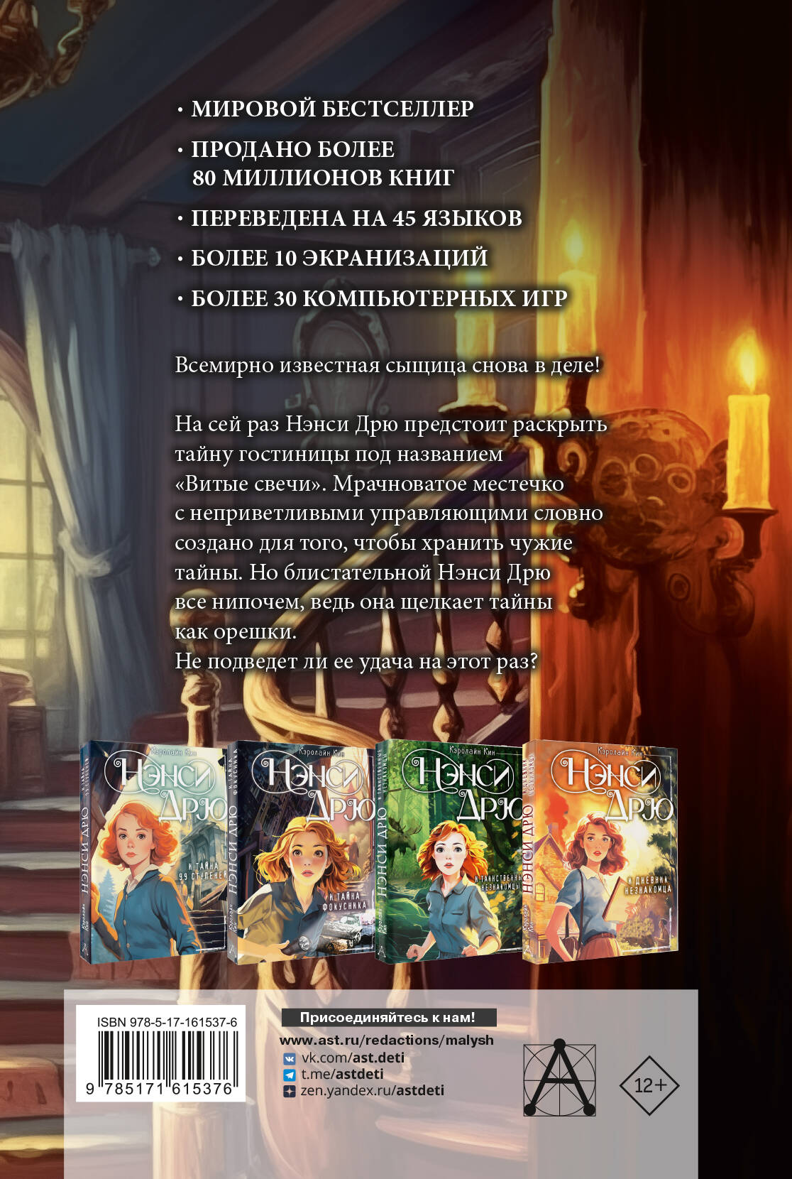 На сей раз Нэнси Дрю предстоит раскрыть тайну гостиницы под названием «Витые свечи». Мрачноватое местечко с неприветливыми управляющими словно создано для того, чтобы хранить чужие тайны. Но блистательной Нэнси Дрю все нипочем, ведь она щелкает тайны как орешки. Не подведет ли ее удача на этот раз? . МИРОВОЙ БЕСТСЕЛЛЕР . ПРОДАНО БОЛЕЕ 80 МИЛЛИОНОВ КНИГ . ПЕРЕВЕДЕНА НА 45 ЯЗЫКОВ . БОЛЕЕ 10 ЭКРАНИЗАЦИЙ . БОЛЕЕ 30 КОМПЬЮТЕРНЫХ ИГР