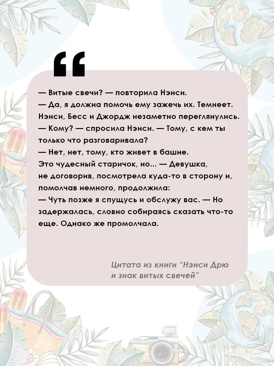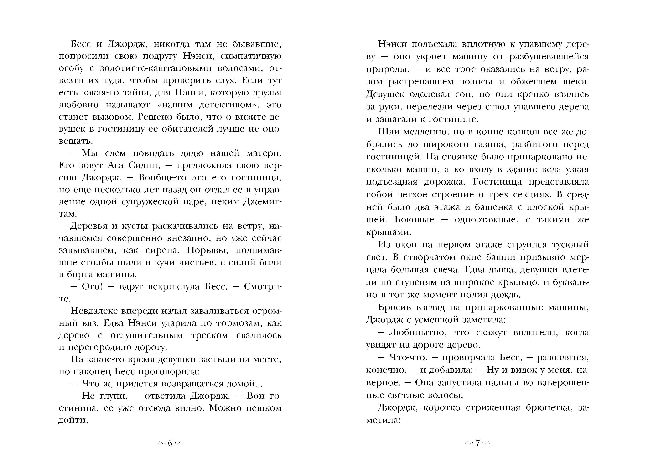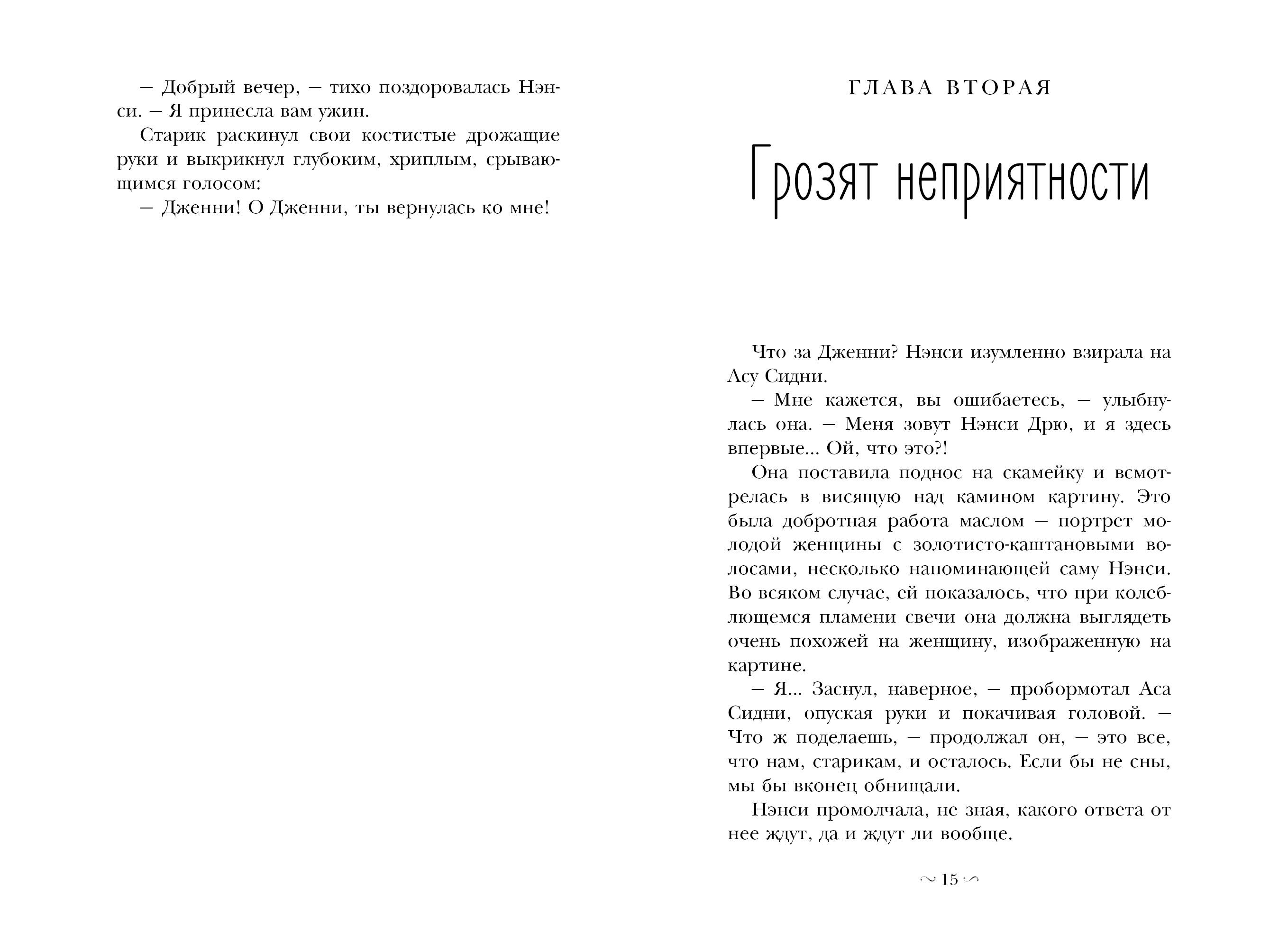 На сей раз Нэнси Дрю предстоит раскрыть тайну гостиницы под названием «Витые свечи». Мрачноватое местечко с неприветливыми управляющими словно создано для того, чтобы хранить чужие тайны. Но блистательной Нэнси Дрю все нипочем, ведь она щелкает тайны как орешки. Не подведет ли ее удача на этот раз? . МИРОВОЙ БЕСТСЕЛЛЕР . ПРОДАНО БОЛЕЕ 80 МИЛЛИОНОВ КНИГ . ПЕРЕВЕДЕНА НА 45 ЯЗЫКОВ . БОЛЕЕ 10 ЭКРАНИЗАЦИЙ . БОЛЕЕ 30 КОМПЬЮТЕРНЫХ ИГР