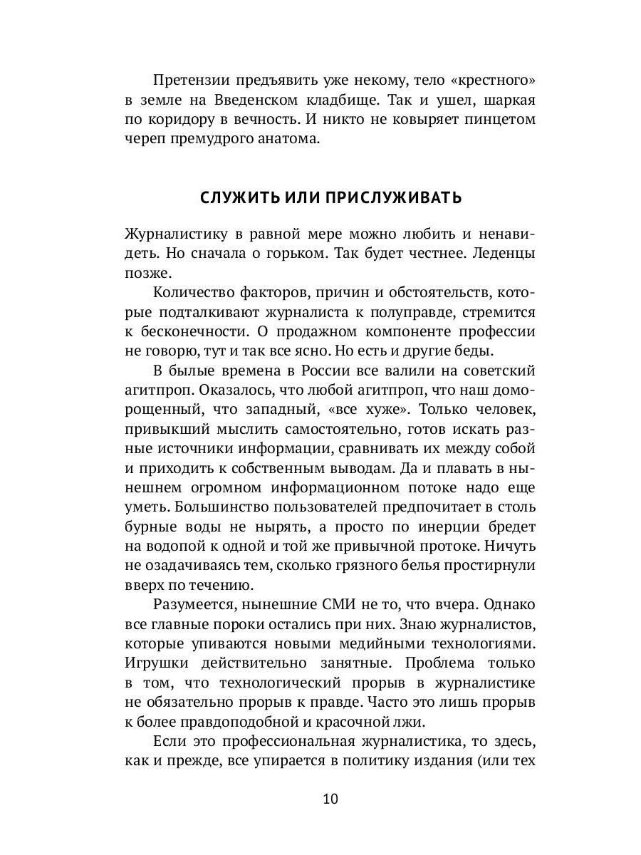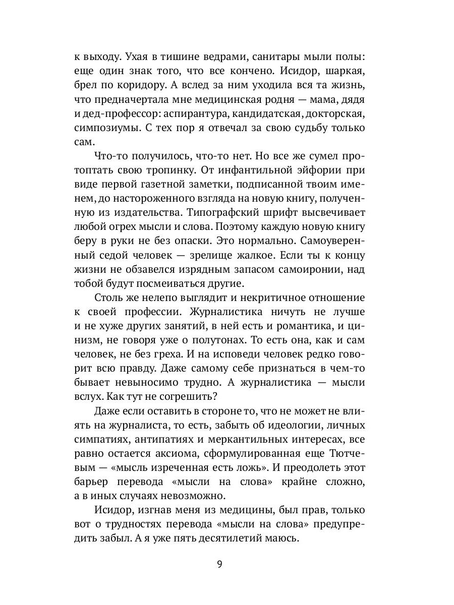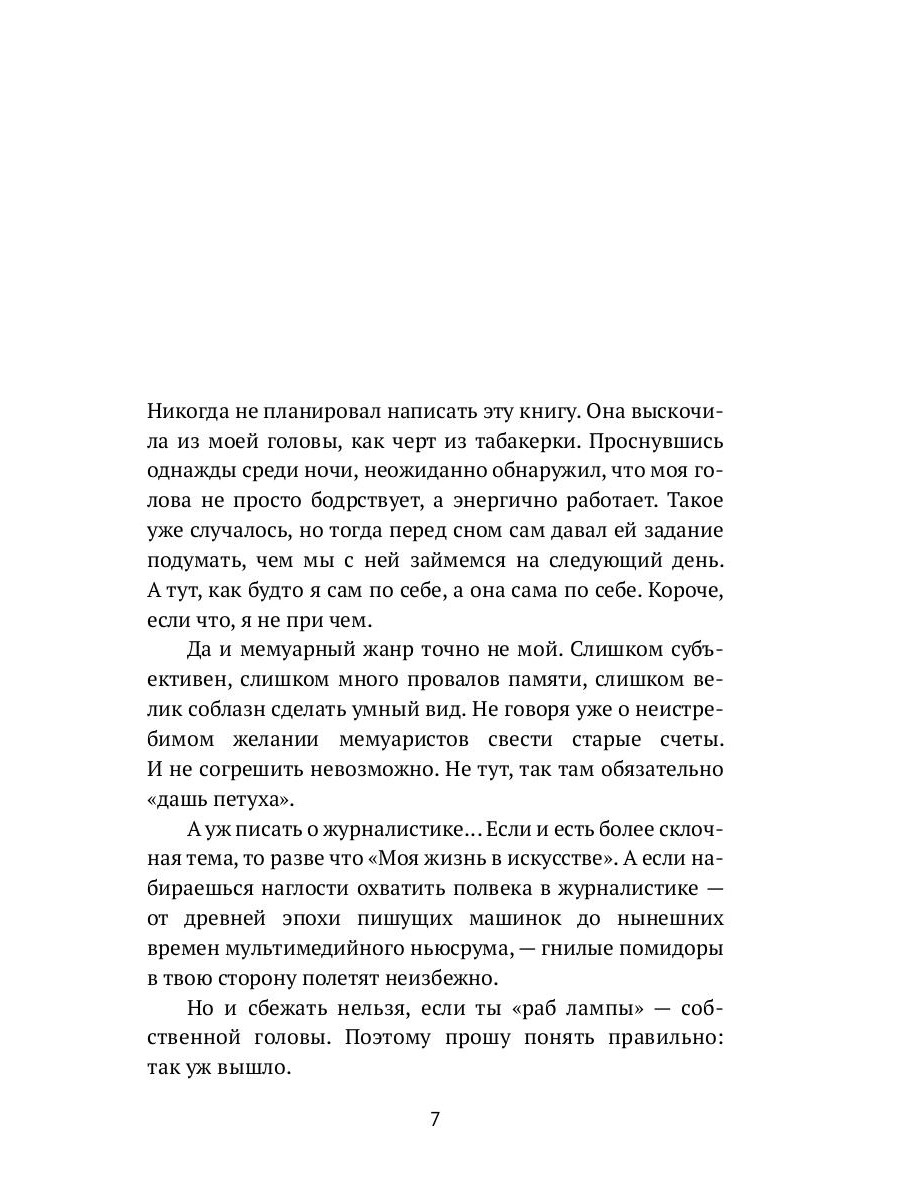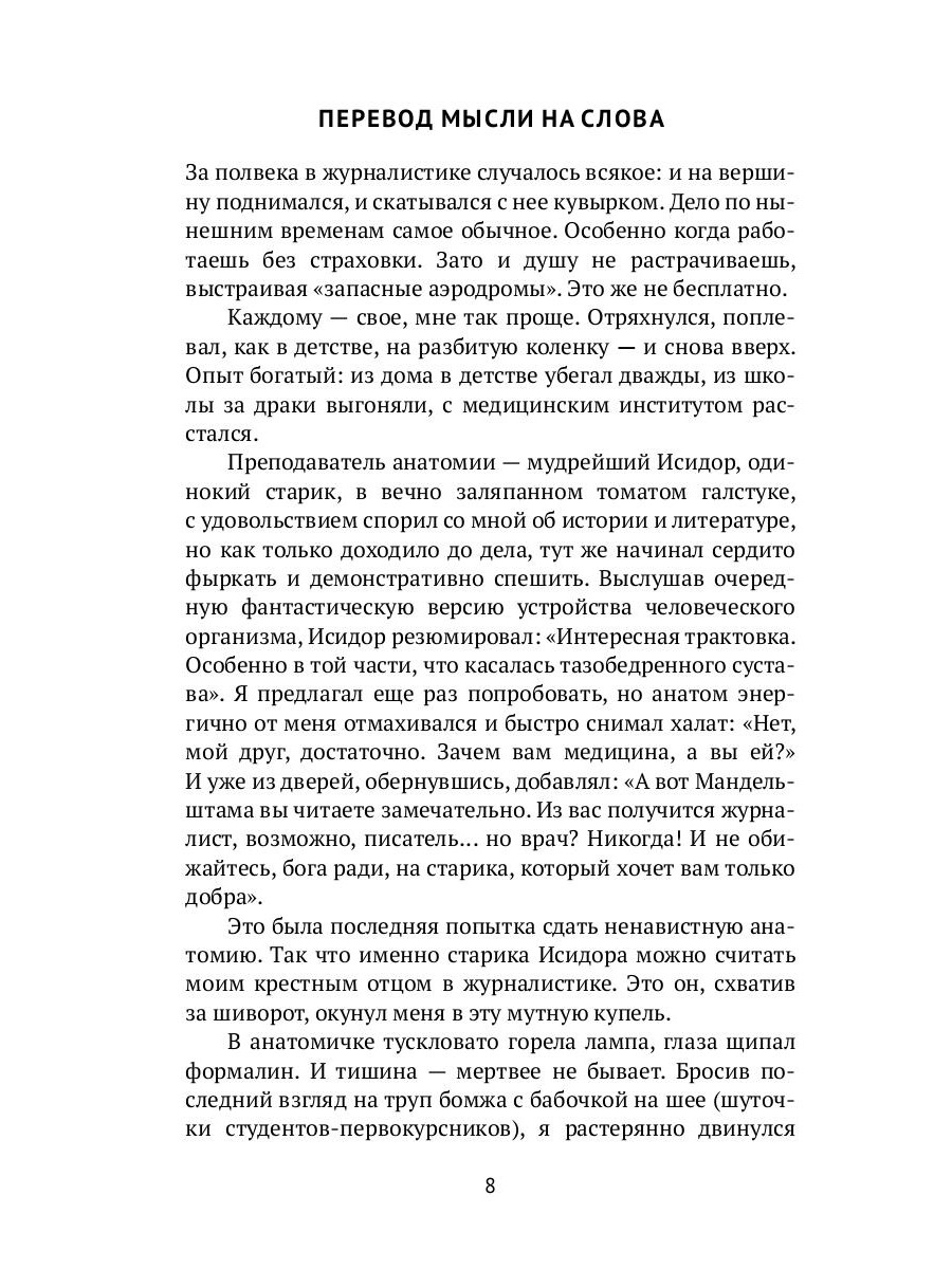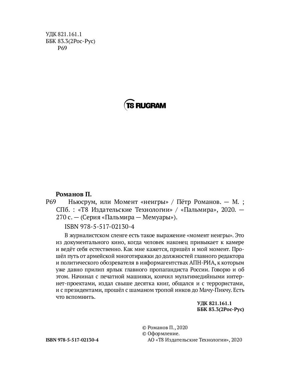 В журналистском сленге есть такое выражение «момент неигры». Это из документального кино, когда человек наконец привыкает к камере и ведёт себя естественно. Как мне кажется, пришёл и мой момент. Прошёл путь от армейской многотиражки до должностей главного редактора и политического обозревателя в информагентствах АПН-РИА, к которым уже давно прилип ярлык главного пропагандиста России. Говорю и об этом. Начинал с печатной машинки, кончил мультимедийными интернет-проектами, издал свыше десятка книг, общался и с террористами, и с президентами, прошёл с шаманом тропой инков до Мачу-Пикчу. Есть что вспомнить.| Издательство | Т8 RUGRAM |