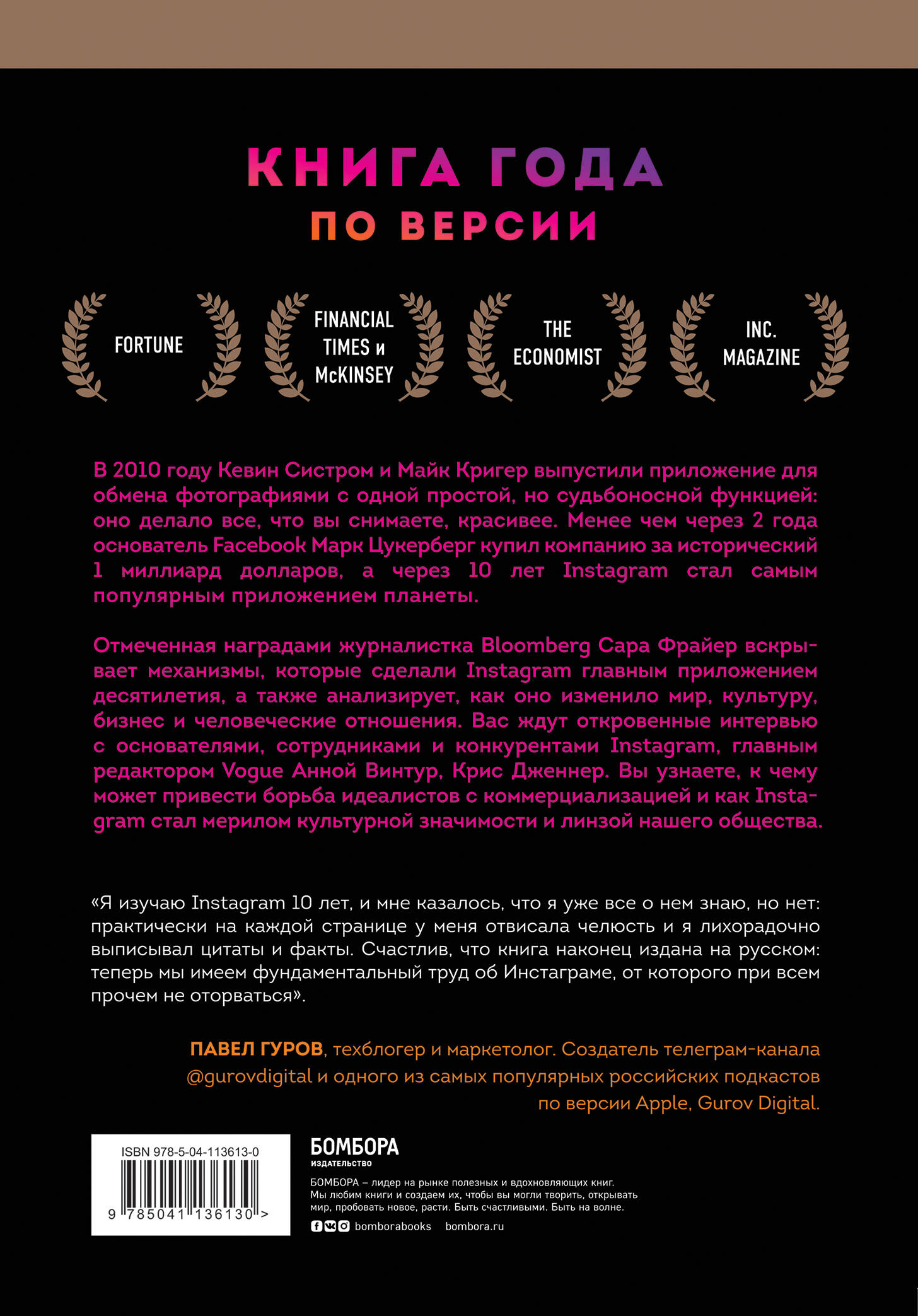 Книга года по версии Financial Times и McKinsey, Fortune, The Economist, Inc. Magazine! В 2010 году Кевин Систром и Майк Кригер выпустили приложение для обмена фотографиями с одной простой, но судьбоносной функцией: оно делало все, что вы снимаете, красивее. Менее чем через 2 года основатель Facebook Марк Цукерберг купил компанию за исторический 1 миллиард долларов. а через 10 лет Instagram стал самым популярным приложением планеты. Отмеченная наградами журналистка Bloomberg Сара Фрайер вскрывает механизмы, которые сделали Instagram главным приложением десятилетия, а также анализирует, как оно изменило мир, культуру, бизнес и человеческие отношения. Вас ждут откровенные интервью с основателями, сотрудниками и конкурентами Instagram, главным редактором Vogue Анной Винтур, Крис Дженнер. Вы узнаете, к чему может привести борьба идеалистов с коммерциализацией и как Instagram стал мерилом культурной значимости и линзой нашего общества. «Я изучаю Instagram 10 лет, - и мне казалось, что я уже все о нем знаю, но нет: практически на каждой странице у меня отвисала челюсть и я лихорадочно выписывал цитаты и факты. Счастлив, что книга наконец издана на русском: теперь мы имеем фундаментальный труд об Инстаграме, от которого при всем прочем не оторваться». - Павел Гуров, техблогер и маркетолог. Создатель телеграм-канала @gurovdigital и одного из самых популярных российских подкастов 2019 года по версии Apple, Gurov Digital «Самая захватывающая книга о драме Кремниевой долины с момента создания Twitter». - Fortune