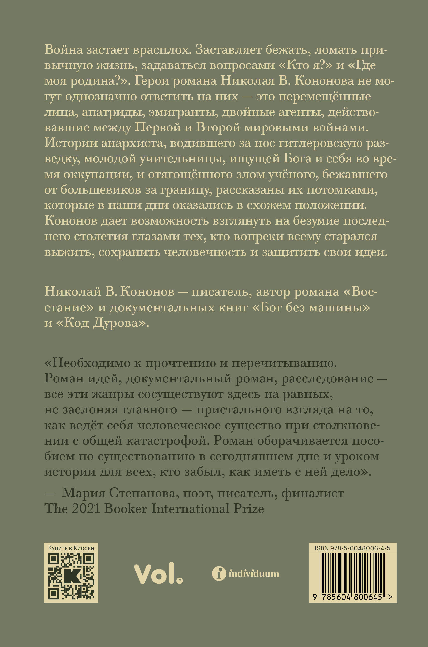 Война застает врасплох. Заставляет бежать, ломать привычную жизнь, задаваться вопросами «Кто я?» и «Где моя родина?». Герои романа Николая В. Кононова не могут однозначно ответить на них - это перемещённые лица, апатриды, эмигранты, двойные агенты, действовавшие между Первой и Второй мировыми войнами. Истории анархиста, водившего за нос гитлеровскую разведку, молодой учительницы, ищущей Бога и себя во время оккупации, и отягощённого злом учёного, бежавшего от большевиков за границу, рассказаны их потомками, которые в наши дни оказались в схожем положении. Кононов дает возможность взглянуть на безумие последнего столетия глазами тех, кто вопреки всему старался выжить, сохранить человечность и защитить свои идеи.| Издательство | ИНДИВИДУУМ ПРИНТ ООО |