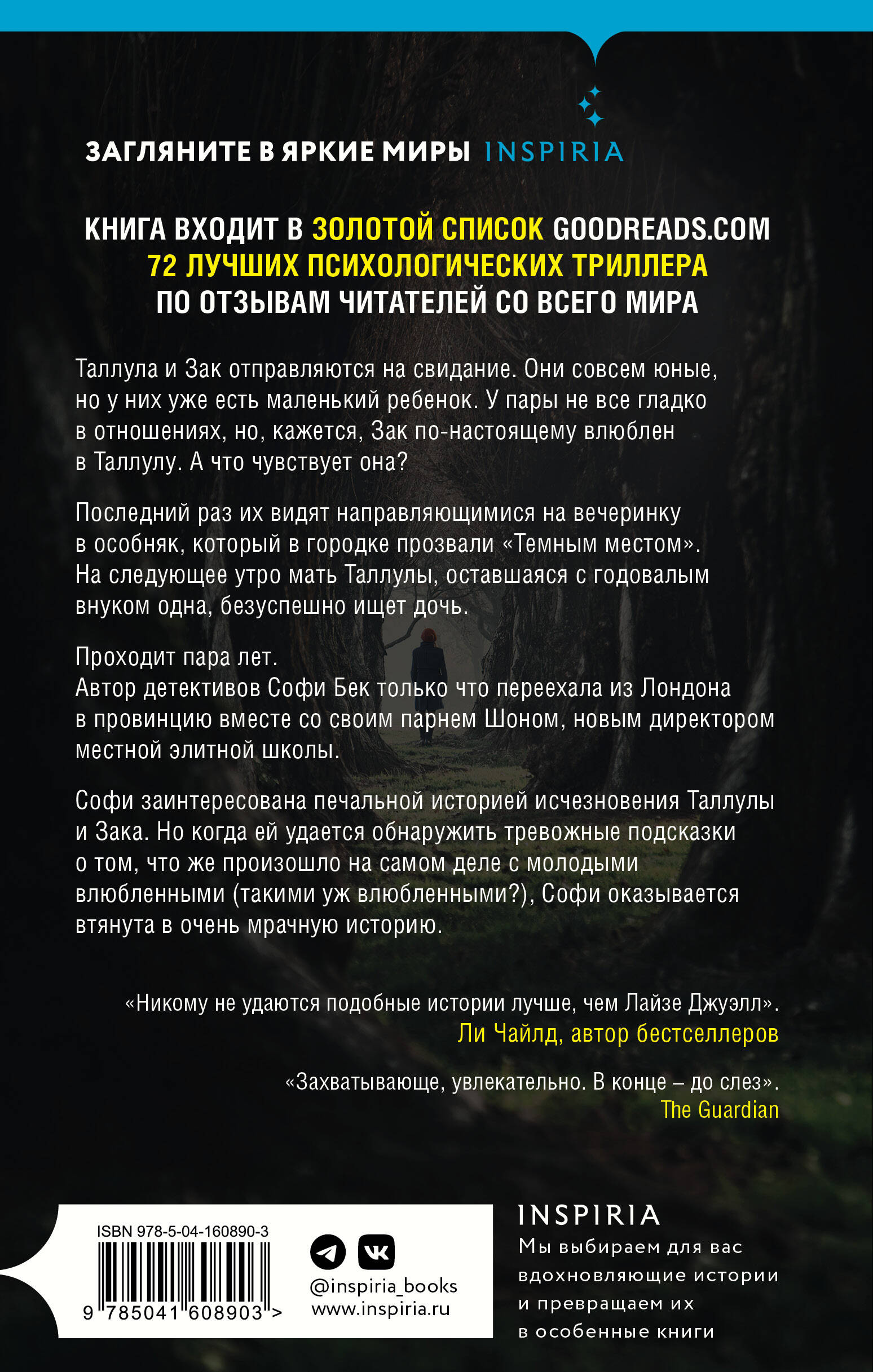Новинка от одной из самых популярных авторов Великобритании. Таллула и Зак отправляются на свидание. Они совсем юные, но у них уже есть маленький ребенок. У пары не все гладко в отношениях, но, кажется, Зак по-настоящему влюблен в Таллулу. А что чувствует она? Последний раз их видят направляющимися на вечеринку в особняк, который прозвали «Темным местом». На следующее утро мать Таллулы, оставшаяся с годовалым внуком одна, безуспешно ищет дочь. Проходит пара лет. Автор детективов Софи Бек только что переехала из Лондона в провинцию вместе со своим парнем Шоном, который является новым директором местной элитной школы. Софи заинтересована печальной историей исчезновения Таллулы и Зака. Но когда ей удается обнаружить тревожные подсказки о том, что же произошло на самом деле с молодыми влюбленными (такими уж влюбленным?), Софи оказывается втянута в очень мрачную историю. *** «Никому не удаются подобные истории лучше, чем Лайзе Джуэлл». - Ли Чайлд, автор бестселлеров «Захватывающе, увлекательно. В конце - до слез». - The Guardian| Издательство | Эксмо |