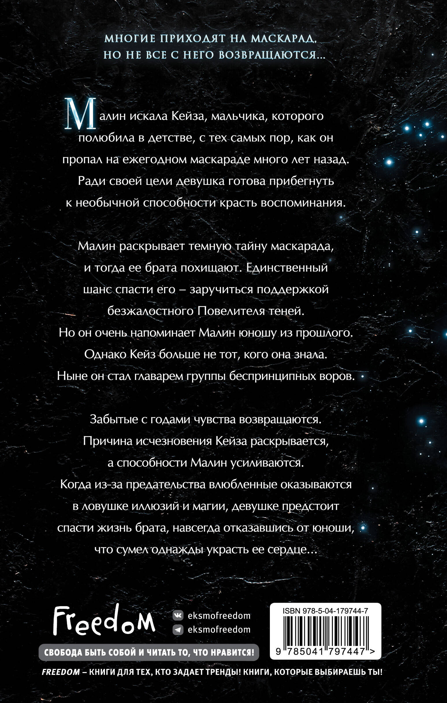 Первая книга трилогии о Восточном королевстве в невероятной фэнтези серии Л. Дж. Эндрюс! Интригующий ретеллинг «Золушки» в скандинавском антураже! Второстепенные персонажи трилогии об Элизе и Валлене теперь станут главными! Вас ждет еще больше приключений, романтики и экшена! Погрузитесь в историю Повелителя теней и таинственного маскарада, но будьте осторожны - не дайте себя обмануть! В этой серии так много неожиданных сюжетных поворотов, что у вас будет буквально захватывать дух, а романтическая линия Малин и Кейза влюбит вас в себя с первой страницы! Сенсация зарубежного Tik-Tok, более 20 млн просмотров видео о книгах этой серии! Запечатанные форзацы и атмосферное внутреннее оформление! Многие приходят на маскарад, но не все с него возвращаются... Малин искала Кейза, мальчика, которого полюбила в детстве, с тех самых пор, как он пропал на ежегодном маскараде много лет назад. Ради своей цели девушка готова прибегнуть к необычной способности красть воспоминания. Малин раскрывает темную тайну маскарада, и тогда ее брата похищают. Единственный шанс спасти его - заручиться поддержкой безжалостного Повелителя теней. Но он очень напоминает Малин юношу из прошлого. Однако Кейз больше не тот, кого она знала. Ныне он стал главарем группы беспринципных воров. Забытые с годами чувства возвращаются. Причина исчезновения Кейза раскрывается, а способности Маллин усиливаются. Когда из-за предательства влюбленные оказываются в ловушке иллюзий и магии, девушке предстоит спасти жизнь брата, навсегда отказавшись от юноши, что сумел однажды украсть ее сердце…| Издательство | ООО "Издательство "Эксмо" |