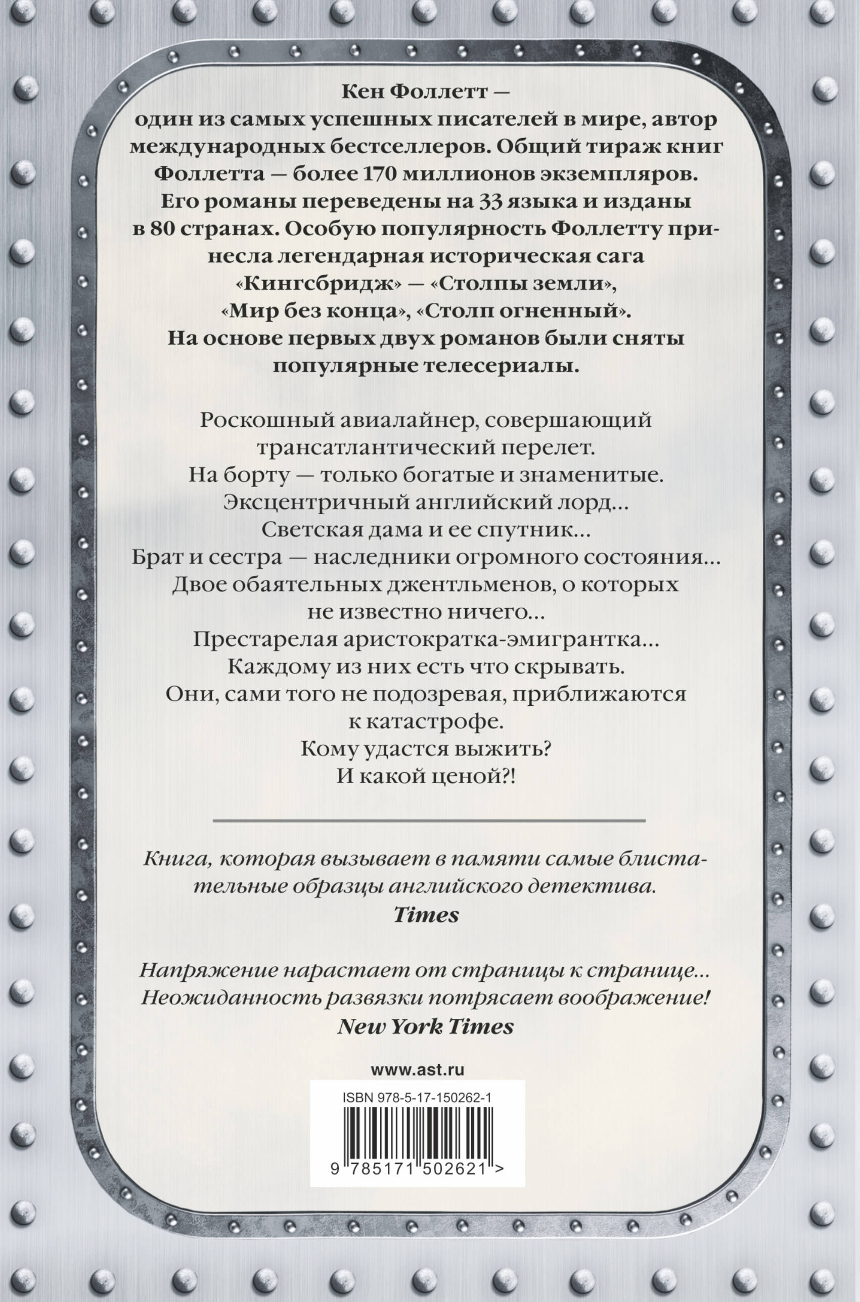 Роскошный авиалайнер, совершающий трансатлантический перелет. На борту - только богатые и знаменитые. Эксцентричный английский лорд… Светская дама и ее спутник… Брат и сестра - наследники огромного состояния… Двое обаятельных джентльменов, о которых неизвестно ничего… Престарелая аристократка-эмигрантка… Каждому из них есть что скрывать. Они, сами того не подозревая, приближаются к катастрофе. Кому удастся выжить? И какой ценой?!| Издательство | АСТ |