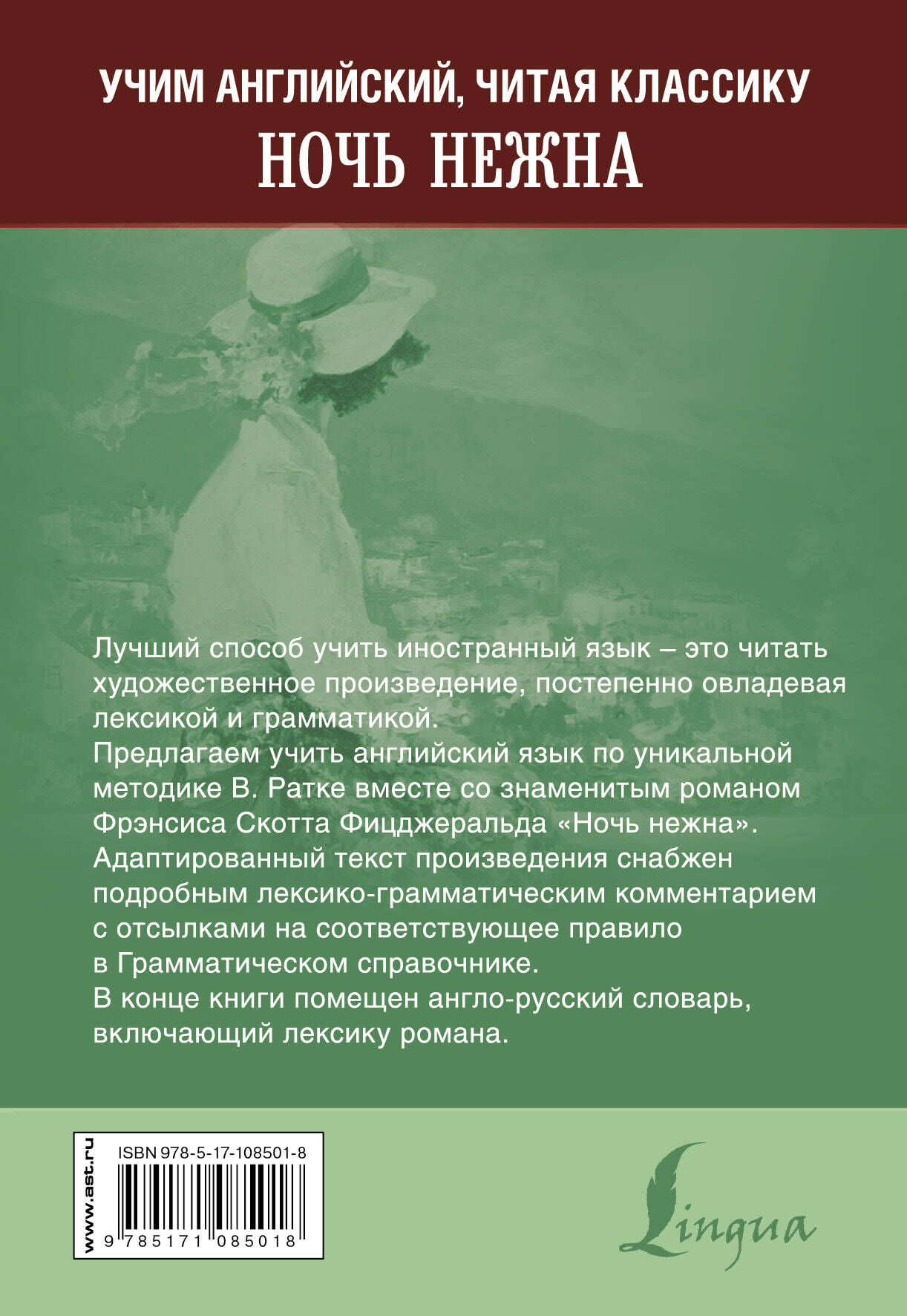 Серия «Учим английский, читая классику» включает адаптированные произведения мировой литературы. Серия известна на рынке и пользуется популярностью. Текст произведения снабжен лексико-грамматическим комментарием, помещенным на полях и содержащим ссылку на соответствующее правило грамматики. Грамматический справочник следует за произведением, материал соответствует уровню выше среднего, им можно пользоваться и после прочтения произведения. Книгу завершает англо-русский словарь с лексикой произведения. «Ночь нежна» - роман американского писателя Ф. С. Фицджеральда, интерес к его творчеству неизменен у читателей уже не одно десятилетие. Издание предназначено для всех, кто учит английский язык и стремится читать книги на английском.