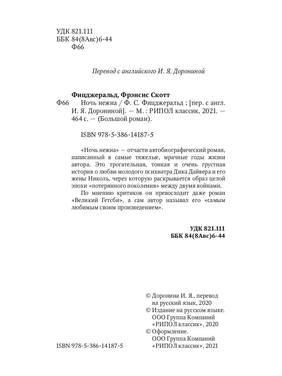 «Ночь нежна» - отчасти автобиографический роман, написанный в самые тяжелые, мрачные годы жизни автора. Это трогательная, тонкая и очень грустная история о любви молодого психиатра Дика Дайвера и его жены Николь, через которую раскрывается образ целой эпохи «потерянного поколения» между двумя войнами. По мнению критиков он превосходит даже роман «Великий Гетсби», а сам автор называл его «самым любимым своим произведением».| Издательство | Рипол Классик |