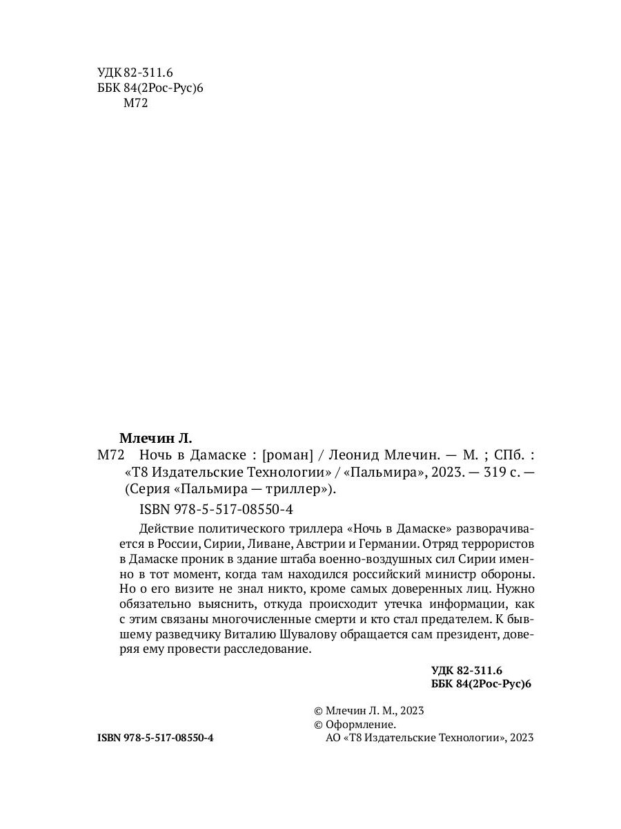 Отряд террористов в Дамаске проник в здание штаба военно-воздушных сил Сирии именно в тот момент, когда там находился наш министр обороны. Но о визите не знал никто, кроме самых доверенных лиц. Нужно обязательно выяснить, откуда происходит утечка информации, как с этим связаны многочисленные смерти и кто стал предателем. К бывшему разведчику Виталию Шувалову обращается сам президент, доверяя ему провести расследование. Действие политического романа Л. Млечина разворачивается в России, Сирии, Ливане, Австрии и Германии. Леонид Михайлович Млечин (р. 1957) - публицист, журналист и обозреватель, автор цикла документальных программ о главных событиях и действующих лицах XX века, член Союза писателей, автор многочисленных книг детективной и документально-расследовательской прозы, публикаций на историческую и политическую тематику, заслуженный работник культуры Российской Федерации, лауреат телевизионной премии ТЭФИ и премии "Просветитель".| Издательство | Т8 RUGRAM |