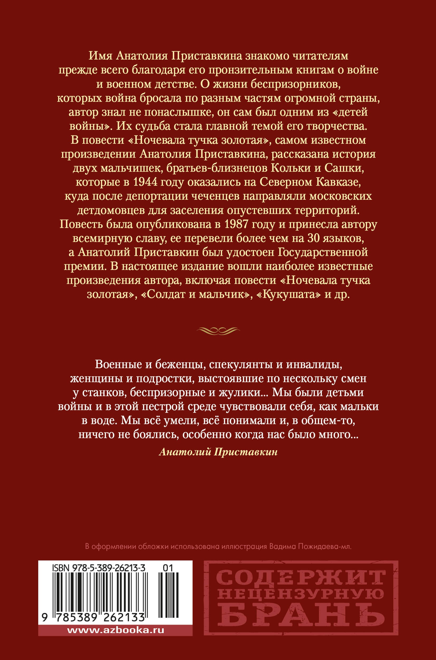 Имя Анатолия Приставкина знакомо читателям прежде всего благодаря его пронзительным книгам о войне и военном детстве. О жизни беспризорников, которых война бросала по разным частям огромной страны, автор знал не понаслышке, он сам был одним из "детей войны". Их судьба стала главной темой его творчества. В повести "Ночевала тучка золотая", самом известном произведении Анатолия Приставкина, рассказана история двух мальчишек, братьев-близнецов Кольки и Сашки, которые в 1944 году оказались на Северном Кавказе, куда после депортации чеченцев направляли московских детдомовцев для заселения опустевших территорий. Повесть была опубликована в 1987 году и принесла автору всемирную славу. Ее перевели более чем на 30 языков, а Анатолий Приставкин был удостоен Государственной премии. В настоящее издание вошли наиболее известные произведения автора, включая повести "Ночевала тучка золотая", "Солдат и мальчик", "Кукушата" и др.| Издательство | Азбука-Аттикус Издат.группа ООО |