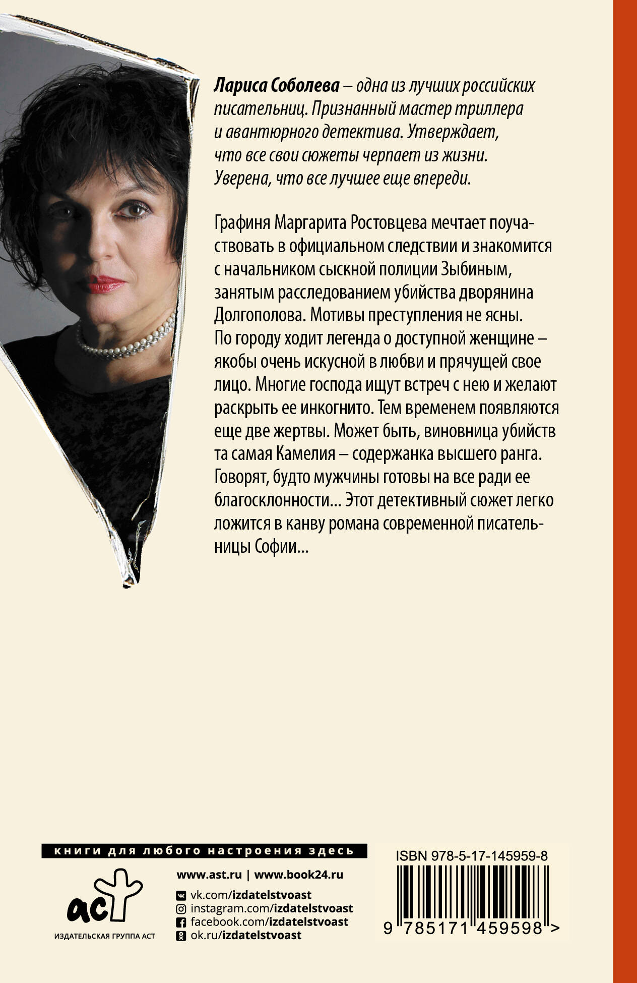 Графиня Маргарита Ростовцева мечтает поучаствовать в официальном следствии и знакомится с начальником сыскной полиции Зыбиным, занятым расследованием убийства дворянина Долгополова. Мотивы преступления не ясны. По городу ходит легенда о доступной женщине - якобы очень искусной в любви и прячущей свое лицо. Многие господа ищут встреч с нею и желают раскрыть ее инкогнито. Тем временем появляются еще две жертвы. Может быть, виновница убийств та самая Камелия - содержанка высшего ранга. Говорят, будто мужчины готовы на все ради ее благосклонности... Этот детективный сюжет легко ложится в канву романа современной писательницы Софии. Потому что она сама оказывается в центре подобных событий: некая дамочка убивает на дороге богатых мужчин и забирает их дорогие автомобили...| Издательство | ИЗДАТЕЛЬСТВО "АСТ" |