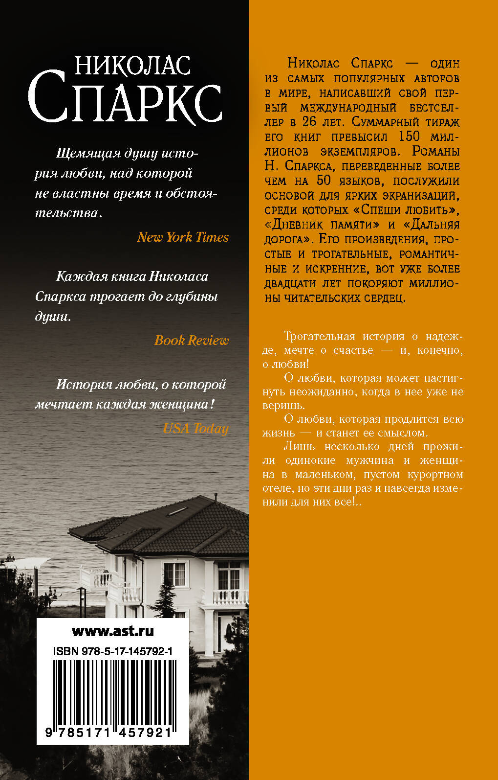 Трогательная история о надежде, мечте о счастье - и, конечно, о любви! О любви, которая может настигнуть неожиданно, когда в нее уже не веришь. О любви, которая продлится всю жизнь - и станет ее смыслом. Лишь несколько дней прожили одинокие мужчина и женщина в маленьком, пустом курортном отеле, но эти дни раз и навсегда изменили для них все!..| Издательство | ИЗДАТЕЛЬСТВО "АСТ" |