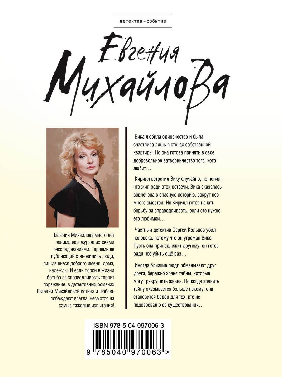 Вика любила одиночество и была счастлива лишь в стенах собственной квартиры. Но она готова принять в свое добровольное затворничество того, кого любит… Кирилл встретил Вику случайно, но понял, что жил ради этой встречи. Вика оказалась вовлечена в опасную историю, вокруг нее много смертей. Но Кирилл готов начать борьбу за справедливость, если это нужно его любимой… Частный детектив Сергей Кольцов убил человека, потому что он угрожал Вике. Пусть она принадлежит другому, он готов ради нее убить еще раз… Иногда близкие люди обманывают друг от друга, бережно храня тайны, которые могут разрушить жизнь. Но когда хранить тайну оказывается больше некому, она становится бедой для тех, кто не подозревал о ее существовании… Евгения Михайлова много лет занималась журналистскими расследованиями. Героями ее публикаций становились невинно осужденные, воспитанники детских домов, люди, лишившиеся доброго имени, дома, надежды. И если порой в жизни борьба за справедливость терпит поражение, в детективных романах Евгении Михайловой истина и любовь побеждают всегда, несмотря на самые тяжелые испытания.| Издательство | ООО "Издательство "Эксмо" |