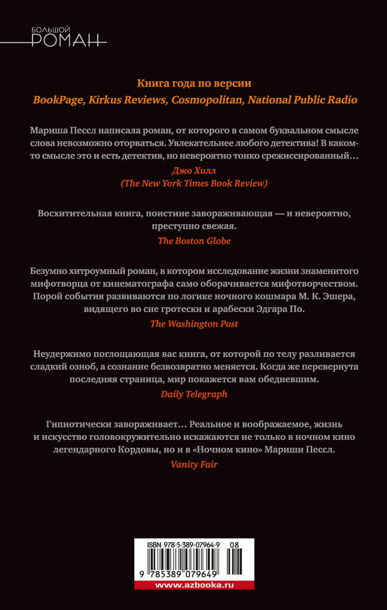 Культовый кинорежиссер Станислас Кордова не появлялся на публике больше 30 лет. Вот уже четверть века его фильмы не выходили в широкий прокат, демонстрируясь лишь на тайных просмотрах, известных как "Ночное кино". Для своих многочисленных фанатов он человек-загадка. Для журналиста Скотта Макгрэта - враг номер один. А для юной пианистки-виртуоза Александры - отец. Дождливой октябрьской ночью тело Александры находят на заброшенном манхэттенском складе. Полицейский вердикт гласит: самоубийство. И это отнюдь не первая смерть в истории семьи Кордовы - династии, на которую будто наложено проклятие. Макгрэт уверен, что это не просто совпадение. Влекомый жаждой мести и ненасытной тягой к истине, он оказывается втянут в зыбкий, гипнотический мир, где все чего-то боятся и всё не то, чем кажется. Когда-то Макгрэт уже пытался вывести Кордову на чистую воду - и поплатился за это рухнувшей карьерой, расстроившимся браком. Теперь же... Читать полностью Культовый кинорежиссер Станислас Кордова не появлялся на публике больше 30 лет. Вот уже четверть века его фильмы не выходили в широкий прокат, демонстрируясь лишь на тайных просмотрах, известных как "ночное кино". Для своих многочисленных фанатов он человек-загадка. Для журналиста Скотта Макгрэта - враг номер один. А для юной пианистки-виртуоза Александры - отец. Дождливой октябрьской ночью тело Александры находят на заброшенном манхэттенском складе. Полицейский вердикт гласит: самоубийство. И это отнюдь не первая смерть в истории семьи Кордовы - династии, на которую будто наложено проклятие. Макгрэт уверен, что это не просто совпадение. Влекомый жаждой мести и ненасытной тягой к истине, он оказывается втянут в зыбкий, гипнотический мир, где все чего-то боятся и всё не то, чем кажется. Когда-то Макгрэт уже пытался вывести Кордову на чистую воду - и поплатился за это рухнувшей карьерой, расстроившимся браком. Теперь же он рискует самим рассудком. Впервые на русском - своего рода римейк культовой "Киномании" Теодора Рошака, будто вышедший из-под коллективного пера Стивена Кинга, Гиллиан Флинн и Стига Ларсона. "Неудержимо поглощающая вас книга, от которой по телу разливается сладкий озноб, а сознание безвозвратно меняется. Когда же перевернута последняя страница, мир покажется вам обедневшим". Daily Telegraph Скрыть| Издательство | Азбука-Аттикус Издат.группа ООО |