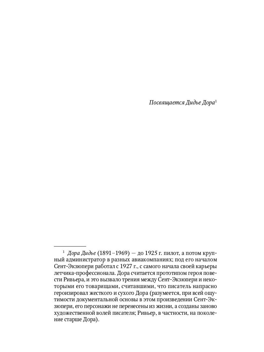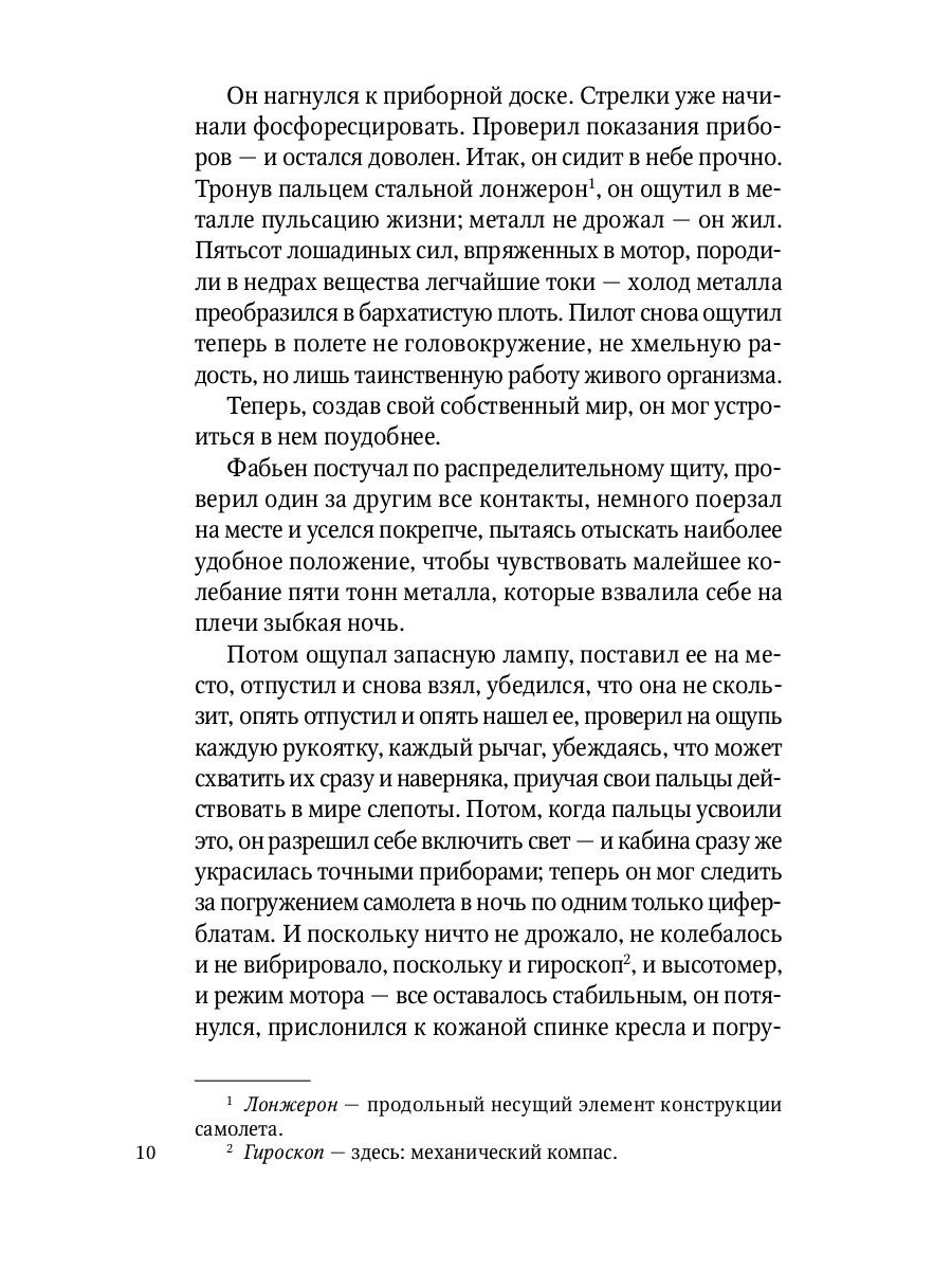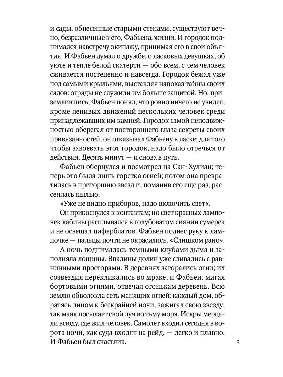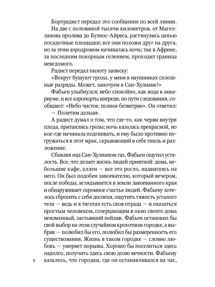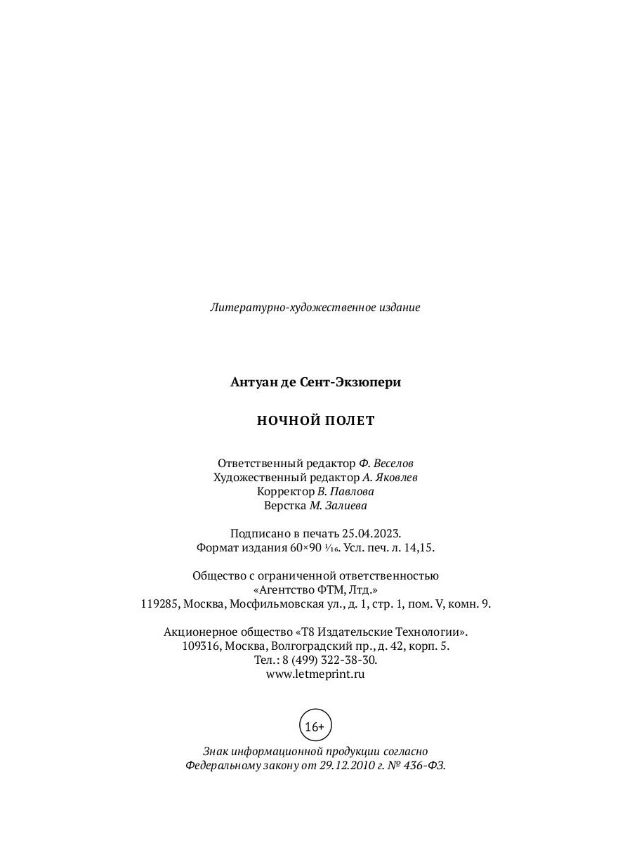 Антуан де Сент-Экзюпери (1900-1944) - писатель, поэт, эссеист и профессиональный летчик. Его биография полна невероятных событий и приключений. Литературное наследие писателя невелико по объему, но его знают во всем мире как автора пронзительных эссе и знаменитого "Маленького принца". В книгу вошли одни из самых известных произведений Антуана де Сент-Экзюпери, герои которых совершают полеты по бесконечным пространствам земли. Роман "Ночной полет" (1931) удостоен литературной премии "Фемина". В 1932 году произведение было экранизировано, а в 1939 году композитор Луиджи Даллапиккола сочинил по его мотивам одноименную оперу. Ночь и ее покорение людьми - один из основных мотивов книги, в которой отважный летчик почтовой авиации летит сквозь ночное небо Южно-Американского континента. В "Военном летчике", когда-то запрещенном, во Франции, где в то время действовало коллаборационистское правительство, но имевшем колоссальный успех в других странах мира, вызывавшем восторженные отзывы и яростные нападки, автор приглашает в очередной полет - непредсказуемый, смертельно опасный полет во тьме ночи, под сильнейшим огненным дождем - но вместе с тем захватывающий, благотворный и незабываемый. Эта книга о поражении и о людях, перенесших его во имя будущей победы.| Издательство | Т8 RUGRAM |