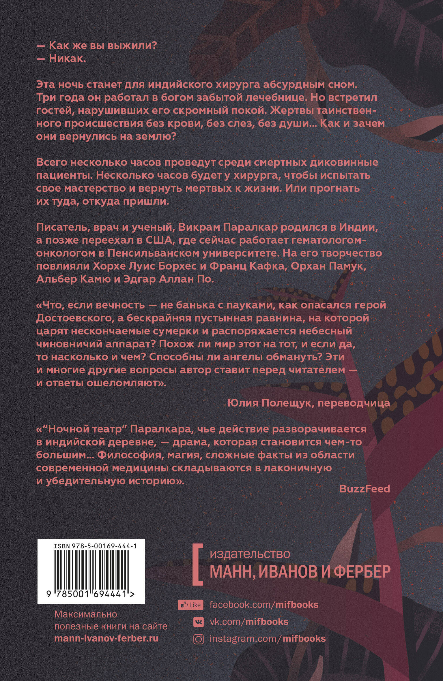 С наступлением сумерек хирург закрывает свою ветхую клинику в Индии. Его день, как и все предыдущие, был непростым. Медикаменты не поступают вовремя, проводка грозит сгореть в любую минуту, а супервизор - коррумпированный правительственный чиновник - вымогает взятки. Работа неблагодарная, но хирург давно потерял надежду на вознаграждение в этой жизни. Однажды ночью его кабинет посещает семья - учитель с беременной женой и маленьким сыном. Дело обычное, если бы не один факт: как незваные гости могли выжить с чудовищными ранами? Теперь до рассвета ему предстоит вернуть семью к жизни. Для кого эта книга: Для любителей Нила Геймана, хорроров, мистических триллеров и современной интеллектуальной прозы. От автора: Он вдруг остро почувствовал абсурд происходящего. Он представил, как они лежат на операционном столе, а он хлопочет над их обескровленной плотью, точно проводя вскрытие - душа его возмутилась против этого слова, но как еще назвать операцию на мертвецах? Ну и вечер, сплошная череда нелепиц. Правда ли, что у мертвых нет души, одно лишь тело? Марионетки - в руках бога? Что, если все это лишь изуверское испытание, вынуждающее его заглянуть в сокровенные глубины собственной души и отыскать там неизвестно что? Вдруг бог решил во что бы то ни стало внушить веру своим творениям, пусть даже вот так жестоко?| Издательство | МАНН, ИВАНОВ И ФЕРБЕР ООО |