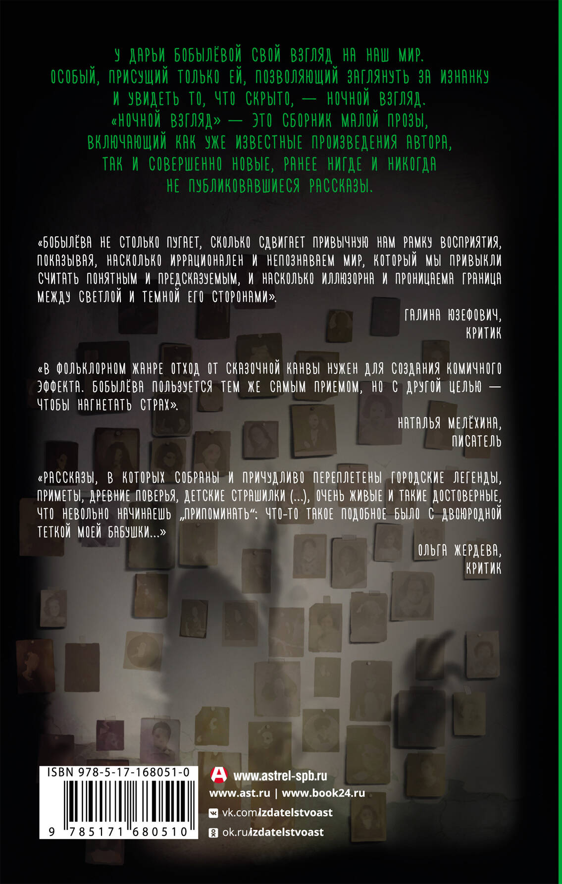 Дарья Бобылёва - настоящая восходящая звезда не только литературы ужасов и мистики, но и всей современной русской прозы вообще. Её произведения вошли в шорт-листы крупных премий «Большая книга», «Ясная поляна» и «Интерпресскон», а права на экранизацию романа «Вьюрки» и вовсе были проданы сразу после выхода книги. У Дарьи Бобылёвой особый взгляд на мир, присущий только ей, позволяющий заглянуть за изнанку и увидеть то, что скрыто - ночной взгляд. В книгу «Ночной взгляд» вошла малая проза писательницы - как уже известные произведения, так и совершенно новые, никогда и нигде прежде не публиковавшиеся рассказы.| Издательство | Издательство "АСТ" |