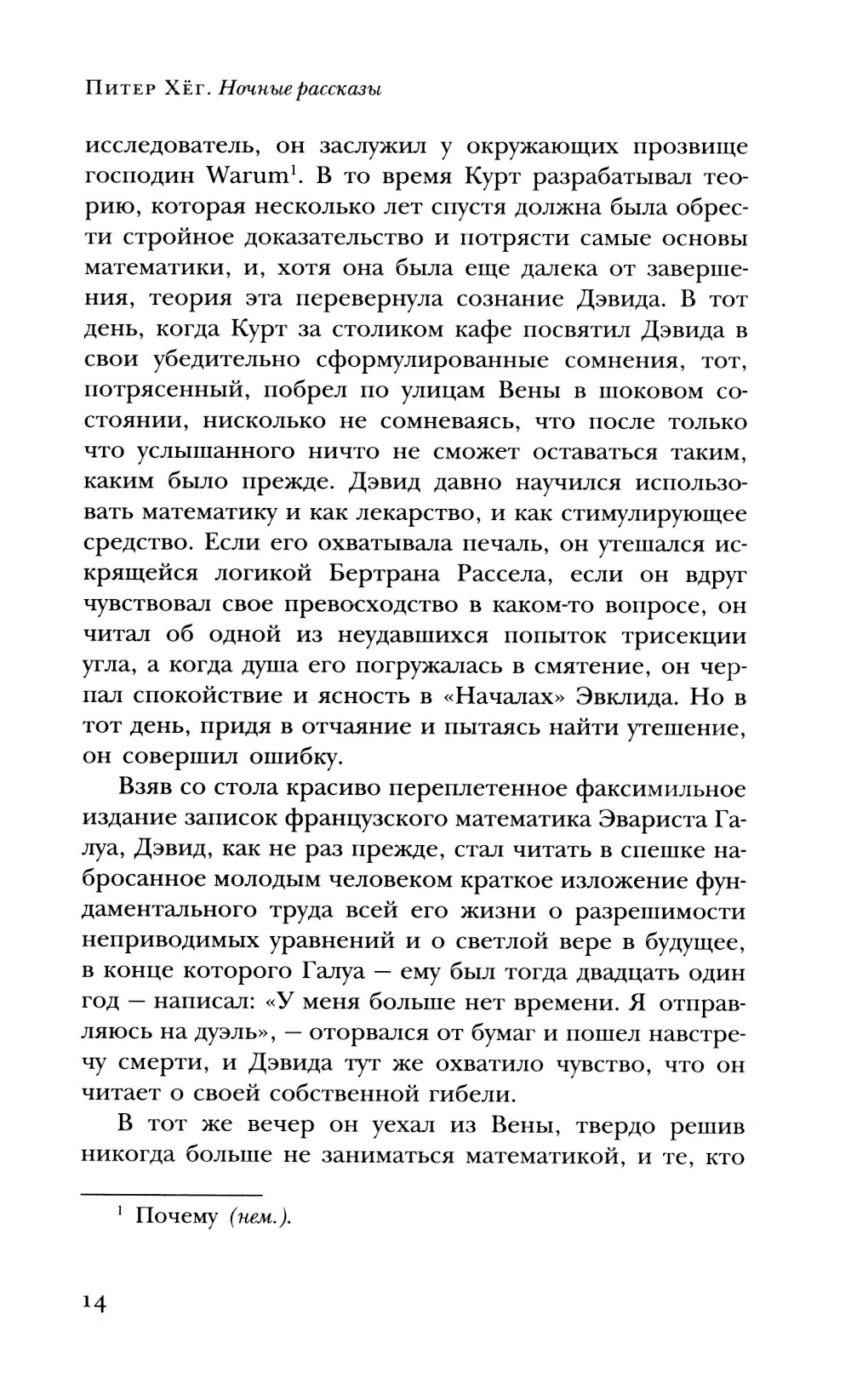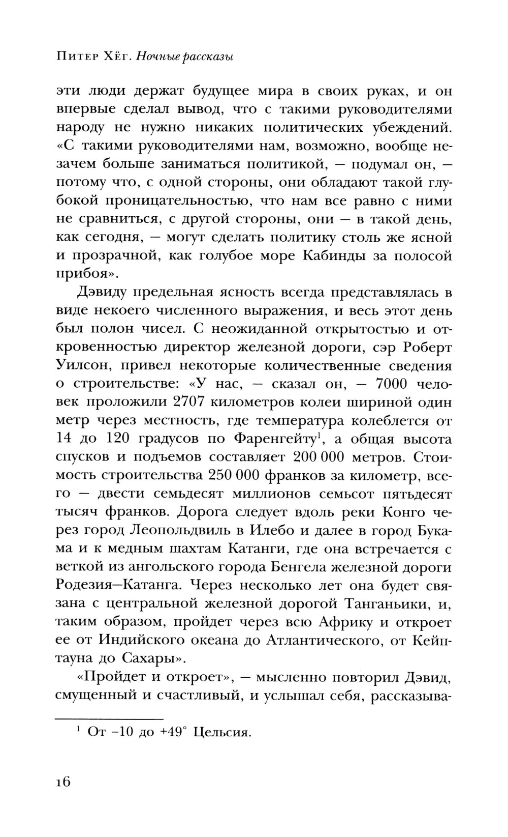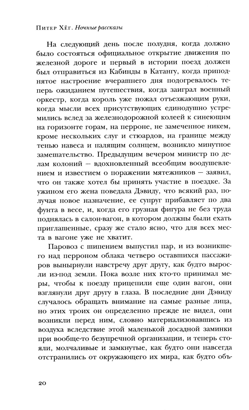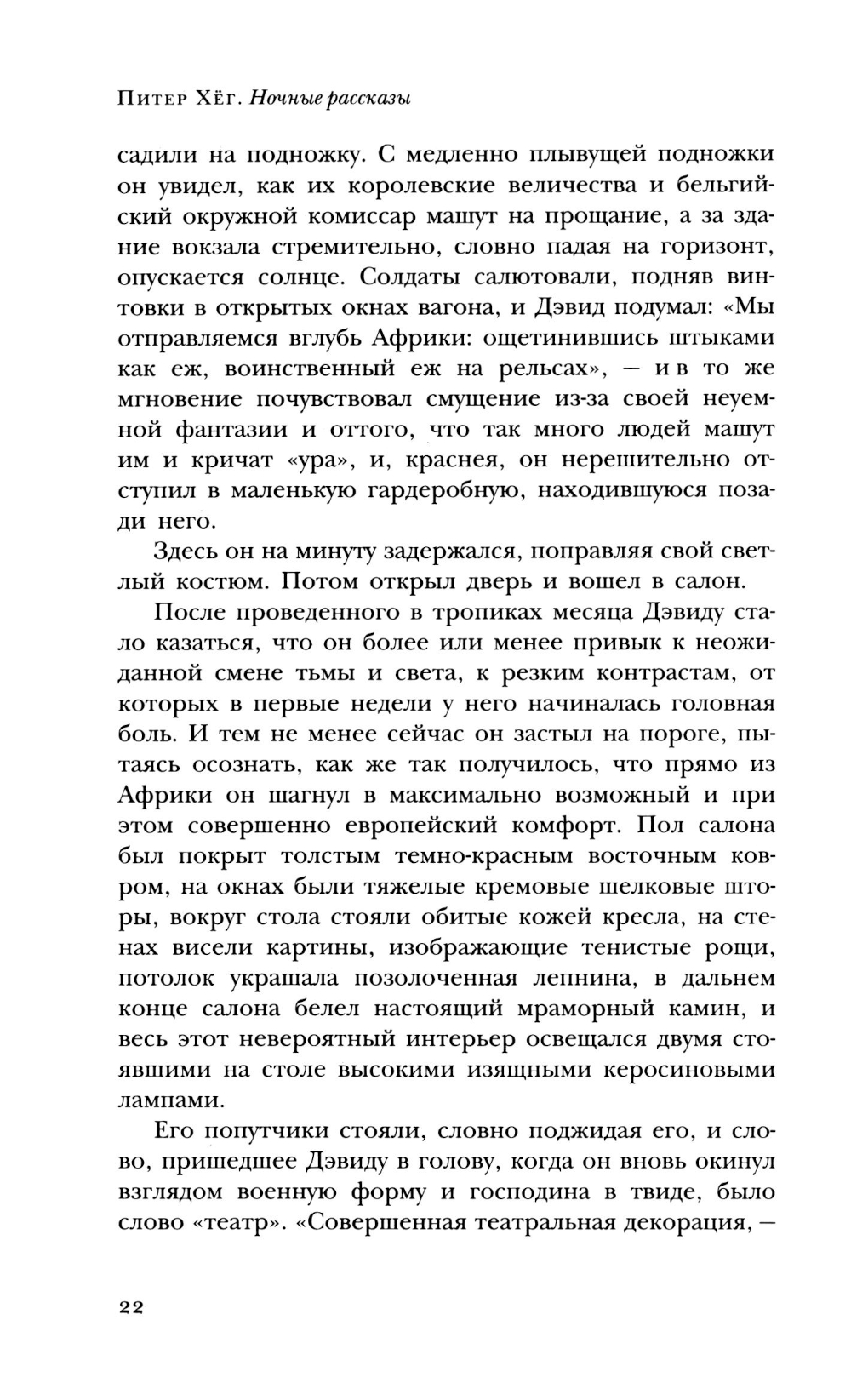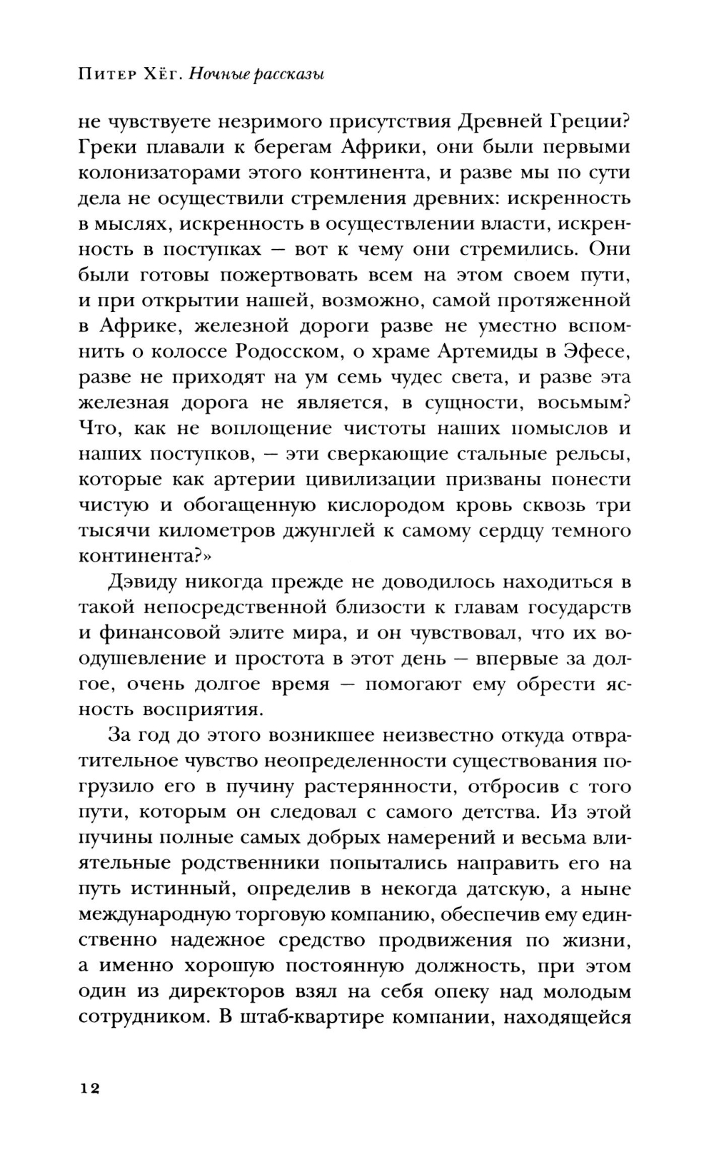 «Ночные рассказы» (1990) - вторая книга знаменитого писателя, хронологически предшествующая роману «Смилла и ее чувство снега» (1992), и единственная у Хёга книга рассказов. Каждый из этих рассказов мог бы превратиться в отдельный роман, однако Питер Хёг не стал этого делать. «Ночные рассказы» - это девять историй, действие которых происходит одной и той же ночью в разных частях света: в бельгийском Конго, в Париже, в лиссабонском порту, в Копенгагене и, конечно же, «на самом краю Дании». Но, как всегда у Питера Хёга, главные события разворачиваются во внутреннем космосе человека, будь то математик, судья, танцовщик, зеркальных дел мастер, художник-авангардист или несостоявшийся лидер датских фашистов. Объединенные общей «ночной» тональностью, все эти рассказы, «так или иначе, - о любви», одиночестве и поисках окончательной ясности, «в тех обстоятельствах, какими они были в ночь на 19 марта 1929 года».| Издательство | Симпозиум |