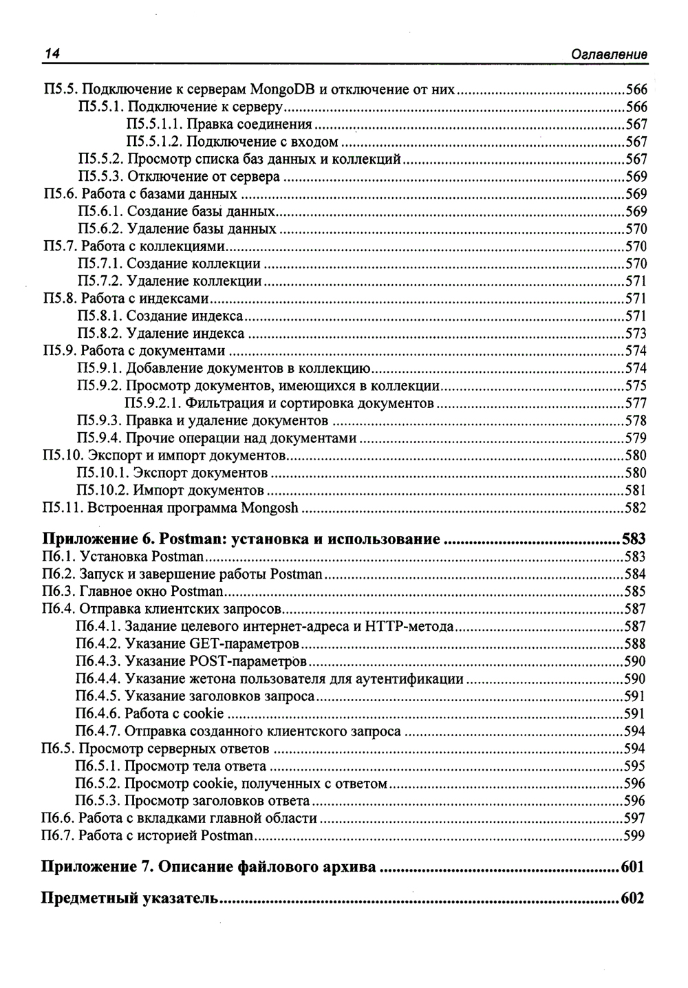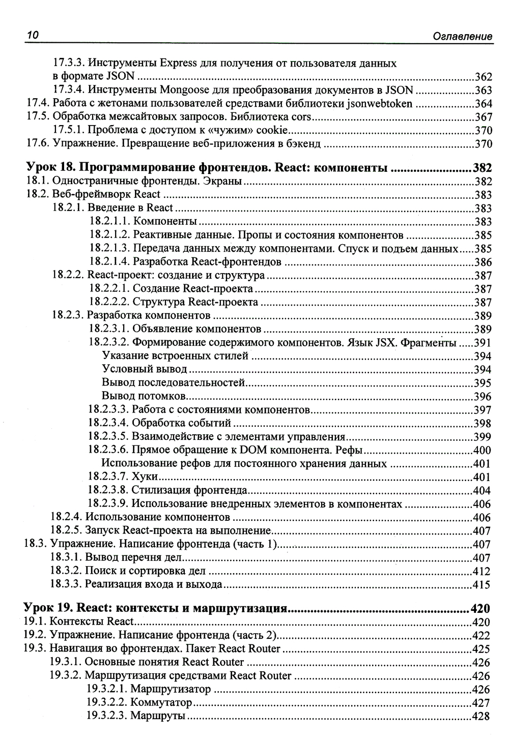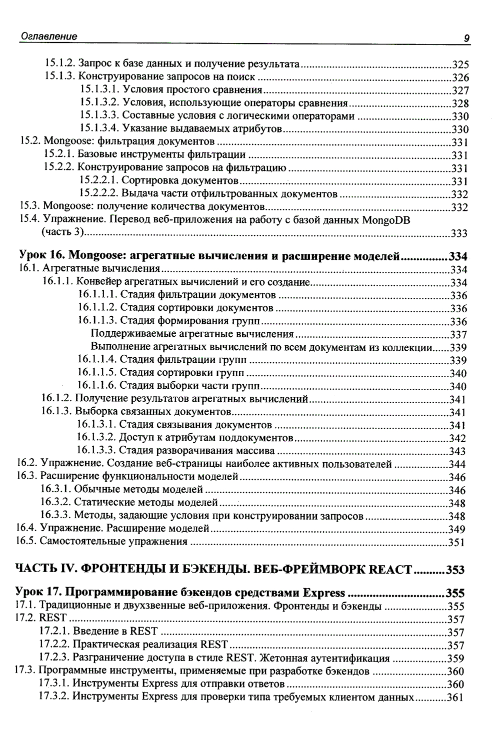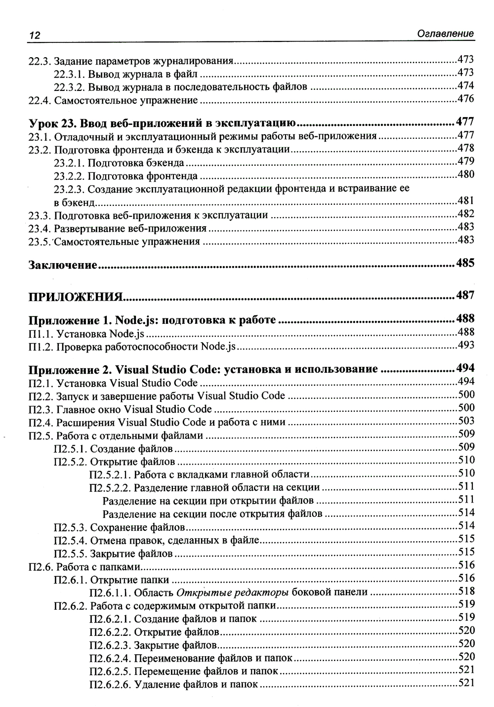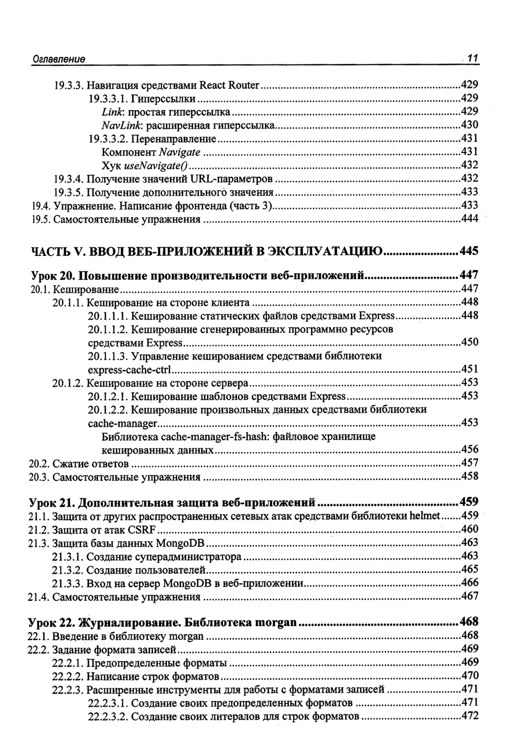 В книге 23 урока, более 40 практических упражнений и заданий для самостоятельной работы. Даны основы программирования на Node. js: проекты и манифесты, установка дополнительных библиотек, импорт и экспорт. Описан серверный веб-фреймворк Express: работа с запросами и ответами, маршрутизация, шаблонизатор EJS, обработка пользовательских данных, статических файлов, валидация, сохранение выгруженных файлов, вывод сообщений об ошибках и разграничение доступа. Показана работа с СУБД MongoDB: запись и выборка данных, фильтрация, сортировка, применение моделей Mongoose. Рассказано о двухзвенных веб-приложениях, бэкендах и фронтендах. Рассмотрено программирование бэкендов средствами Express и фронтендов с применением клиентского веб-фреймворка React. Затронуты вопросы повышения производительности и защищённости веб-приложений, ввод их в эксплуатацию. Электронный архив на сайте издательства содержит полный исходный код описанных в книге примеров.| Издательство | BHV(БХВ) |