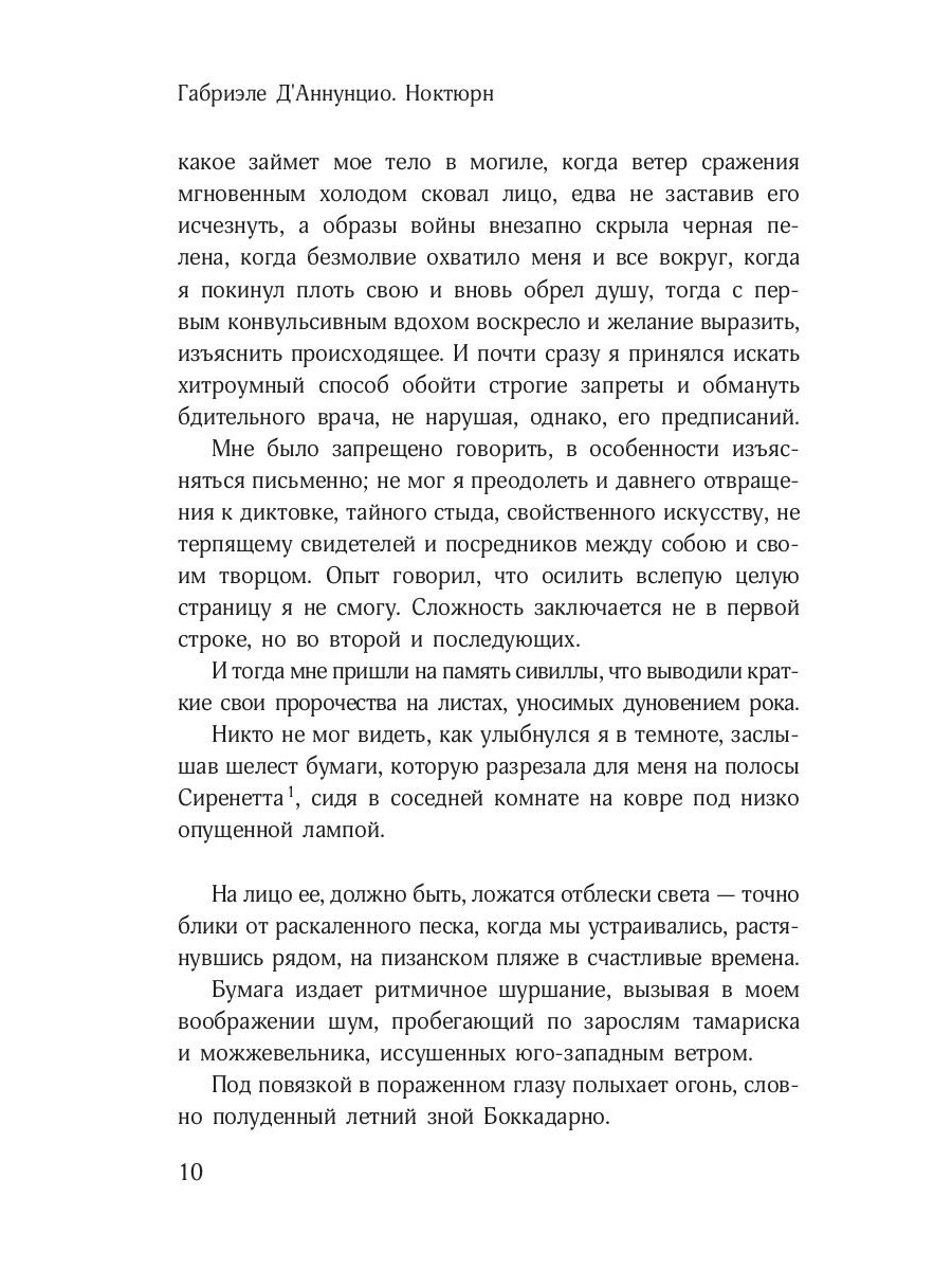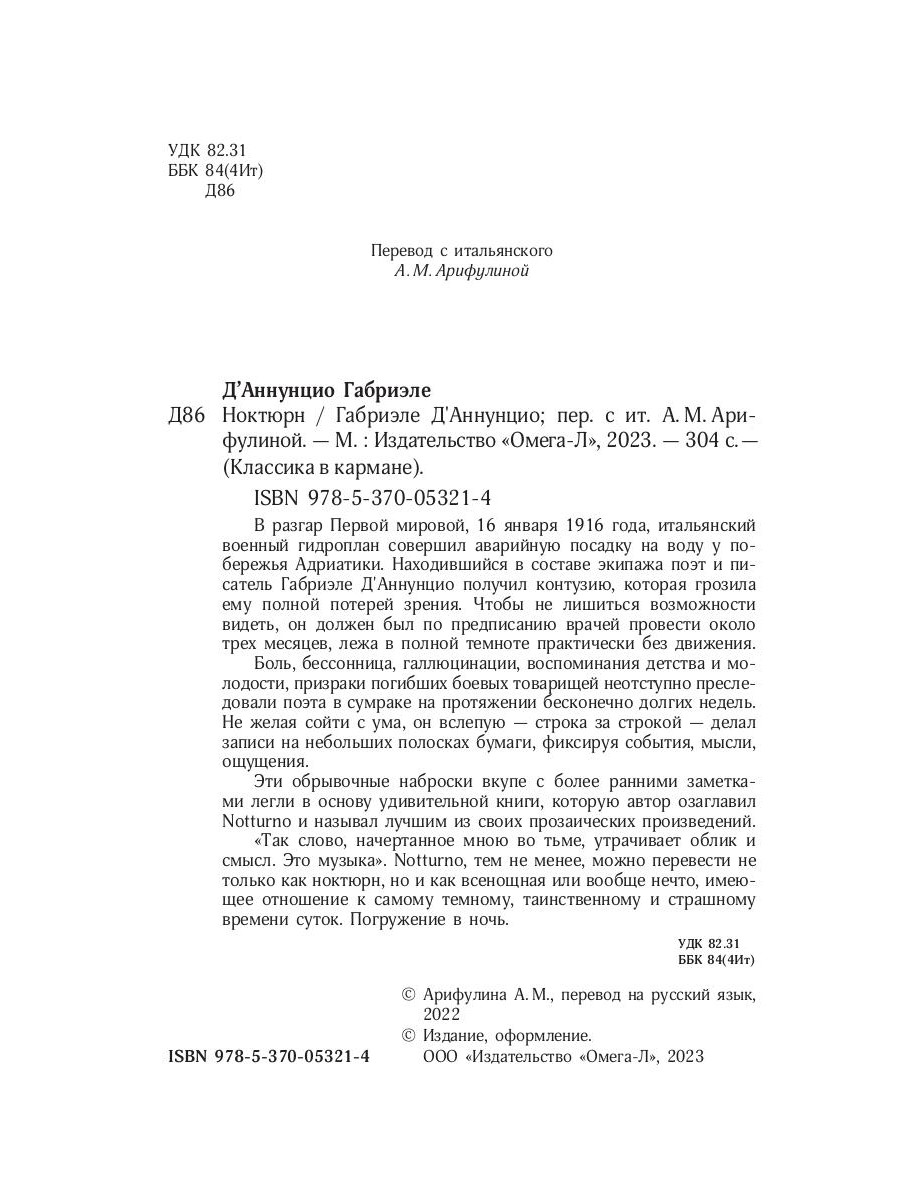 Габриэле Д`Аннунцио (1863-1938) - поэт, писатель и драматург. Модернист, икона декаданса, герой Первой мировой войны, сокрушитель общественных устоев, классик итальянской литературы, один из наиболее ярких персонажей блестящей и бурной эпохи рубежа веков, он оказал огромное влияние на современников, как обожавших его, так и категорически отвергавших. Споры вокруг его творчества и личности до сих пор вызывают живой интерес у читающей публики. В разгар Первой мировой, 16 января 1916 года, итальянский военный гидроплан совершил аварийную посадку на воду у побережья Адриатики. Находившийся в составе экипажа Габриэле Д'Аннунцио получил контузию, которая грозила ему полной потерей зрения. Чтобы не лишиться возможности видеть, он должен был по предписанию врачей провести около трех месяцев, лежа в полной темноте практически без движения. Боль, бессонница, галлюцинации, воспоминания детства и молодости, призраки погибших боевых товарищей неотступно преследовали поэта в сумраке на протяжении бесконечно долгих недель. Не желая сойти с ума, он вслепую - строка за строкой - делал записи на небольших полосках бумаги, фиксируя события, мысли, ощущения. Эти обрывочные наброски вкупе с более ранними заметками легли в основу удивительной книги, которую автор озаглавил Notturno и называл лучшим из своих прозаических произведений. "Так слово, начертанное мною во тьме, утрачивает облик и смысл. Это музыка". Notturno, тем не менее, можно перевести не только как ноктюрн, но и как всенощная или вообще нечто, имеющее отношение к самому темному, таинственному и страшному времени суток. Погружение в ночь.| Издательство | Омега-Л |