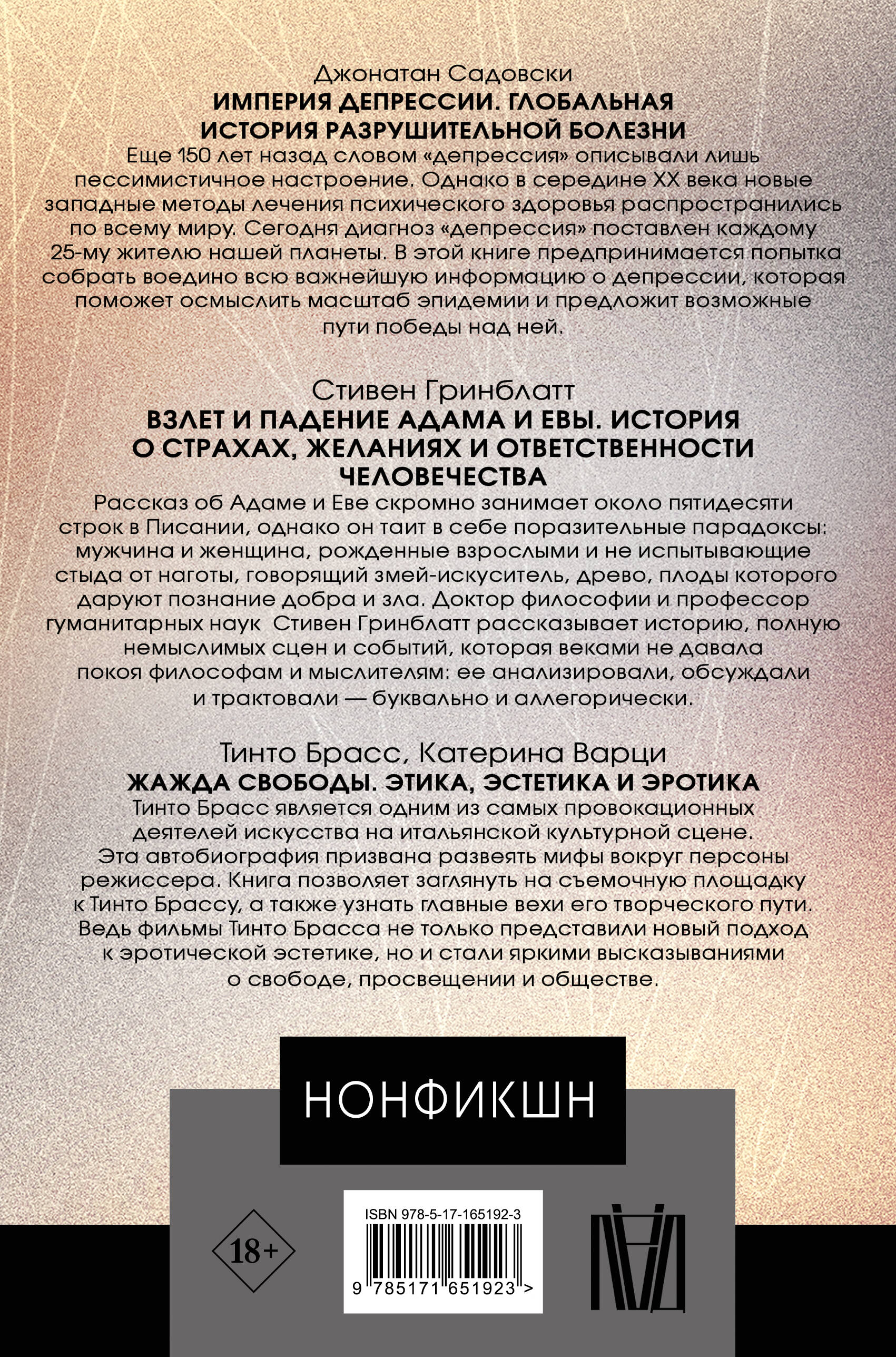 Взлет и падение Адама и Евы. История о страхах, желаниях и ответственности человечества Рассказ об Адаме и Еве скромно занимает около пятидесяти строк в Писании, однако он таит в себе поразительные парадоксы: мужчина и женщина, рожденные взрослыми и не испытывающими стыда от наготы, говорящий змей-искуситель, древо, плоды которого даруют познание добра и зла. Доктор философии и профессор гуманитарных наук Стивен Гринблатт рассказывает историю, полную немыслимых сцен и событий, которая веками не давала покоя философам и мыслителям - ее анализировали, обсуждали и трактовали - буквально и аллегорически. Империя депрессии. Глобальная история разрушительной болезни Еще 150 лет назад словом "депрессия" описывали лишь пессимистичное настроение. Однако в середине ХХ века новые западные методы лечения психического здоровья распространились по всему миру. Сегодня диагноз "депрессия" поставлен каждому 25-му жителю нашей планеты. В этой книге предпринимается попытка собрать воедино всю важнейшую информацию о депрессии, которая поможет осмыслить масштаб эпидемии и предложить возможные пути победы над ней. Жажда свободы. Этика, эстетика и эротика Тинто Брасс является одним из самых провокационных деятелей искусства на итальянской культурной сцене. Эта автобиография призвана развеять мифы вокруг персоны режиссера. Книга позволяет заглянуть на съемочную площадку к Тинто Брассу, а также узнать главные вехи его творческого пути. Ведь фильмы Тинто Брасса не только представили новый подход к эротической эстетике, но и стали яркими высказываниями о свободе, просвещении и обществе.