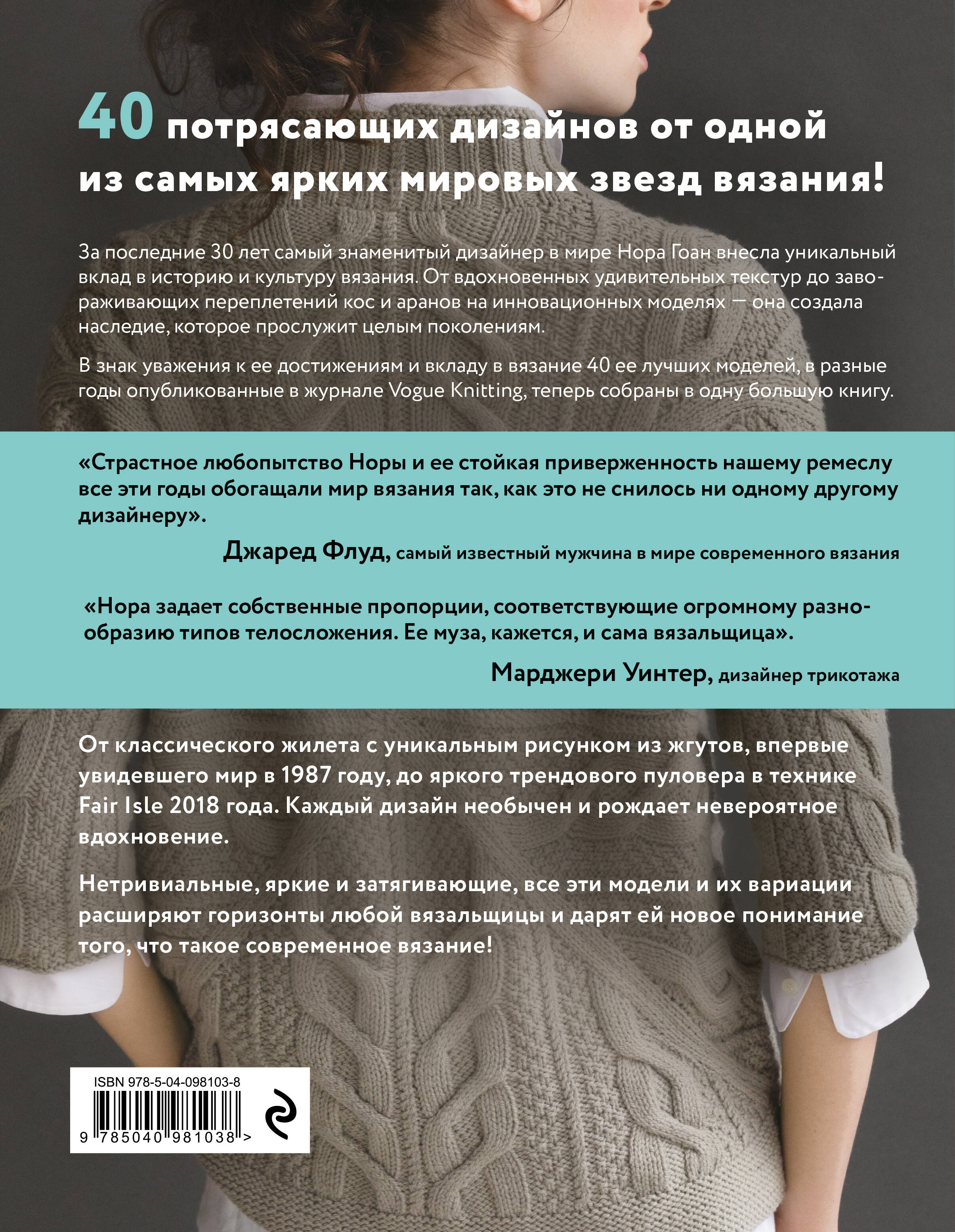 Впервые в России! Сборник авторских вязаных моделей от самой яркой звезды мирового вязания Норы Гоан! Культовые дизайны, опубликованные в знаменитом журнале VOGUE KNITTING за последние 30 лет, тщательно отобранные и великолепно представленные в книге с помощью четких схем, красочных иллюстраций, уникальных методически выверенных рекомендаций автора. Самая востребованная книга среди европейских и американских вязальщиц за последний год и бесценный подарок отечественным мастерицам, который навсегда останется актуальным.