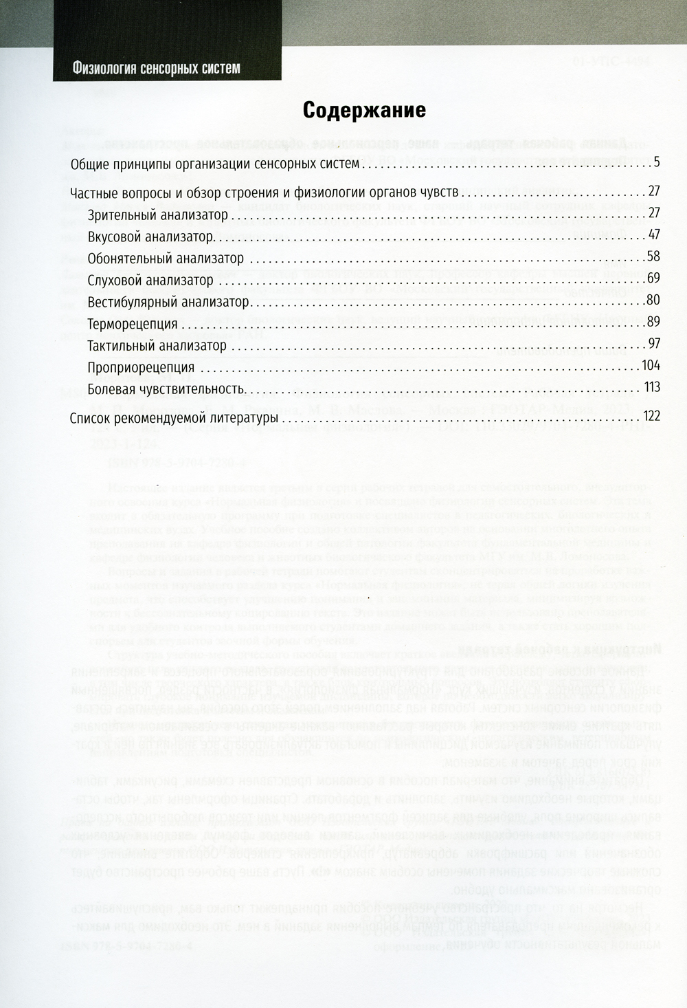 Настоящее издание является третьим в серии рабочих тетрадей для самостоятельного, внеаудиторного освоения курса «Нормальная физиология» и посвящено физиологии сенсорных систем. Эта тема входит в обязательную программу при подготовке специалистов в педагогических, биологических и медицинских вузах. Учебное пособие создано коллективом авторов на основании многолетнего опыта преподавания на кафедре физиологии и общей патологии факультета фундаментальной медицины и кафедре физиологии человека и животных биологического факультета МГУ им. М.В. Ломоносова. Вопросы и задания в рабочей тетради помогают студентам сконцентрироваться на проработке важных моментов изучаемого раздела курса «Нормальная физиология», не теряя общей логики изучения предмета, что способствует улучшению понимания и запоминания материала, минимизируя возможности к бессознательному копированию текста. Это издание может быть использовано преподавателями для удобного контроля выполняемого студентами домашнего задания, а также стать хорошим подспорьем для студентов заочной формы обучения. Структура учебно-методического пособия включает краткое введение в проблему, четко сформулированную цель каждого раздела, пункты для самостоятельного изучения и список задач и вопросов, в том числе творческого характера, а также блок контрольных вопросов. Это позволяет студенту сформировать глубокое понимание изучаемой дисциплины, которое по необходимости легко актуализируется при подготовке к зачетам и экзаменам. Издание предназначено студентам медицинских, биологических, фармакологических специальностей, но также будет полезно для обучающихся по психологическим, педагогическим, ветеринарным направлениям подготовки специалистов.| Издательство | ГЭОТАР-Медиа |