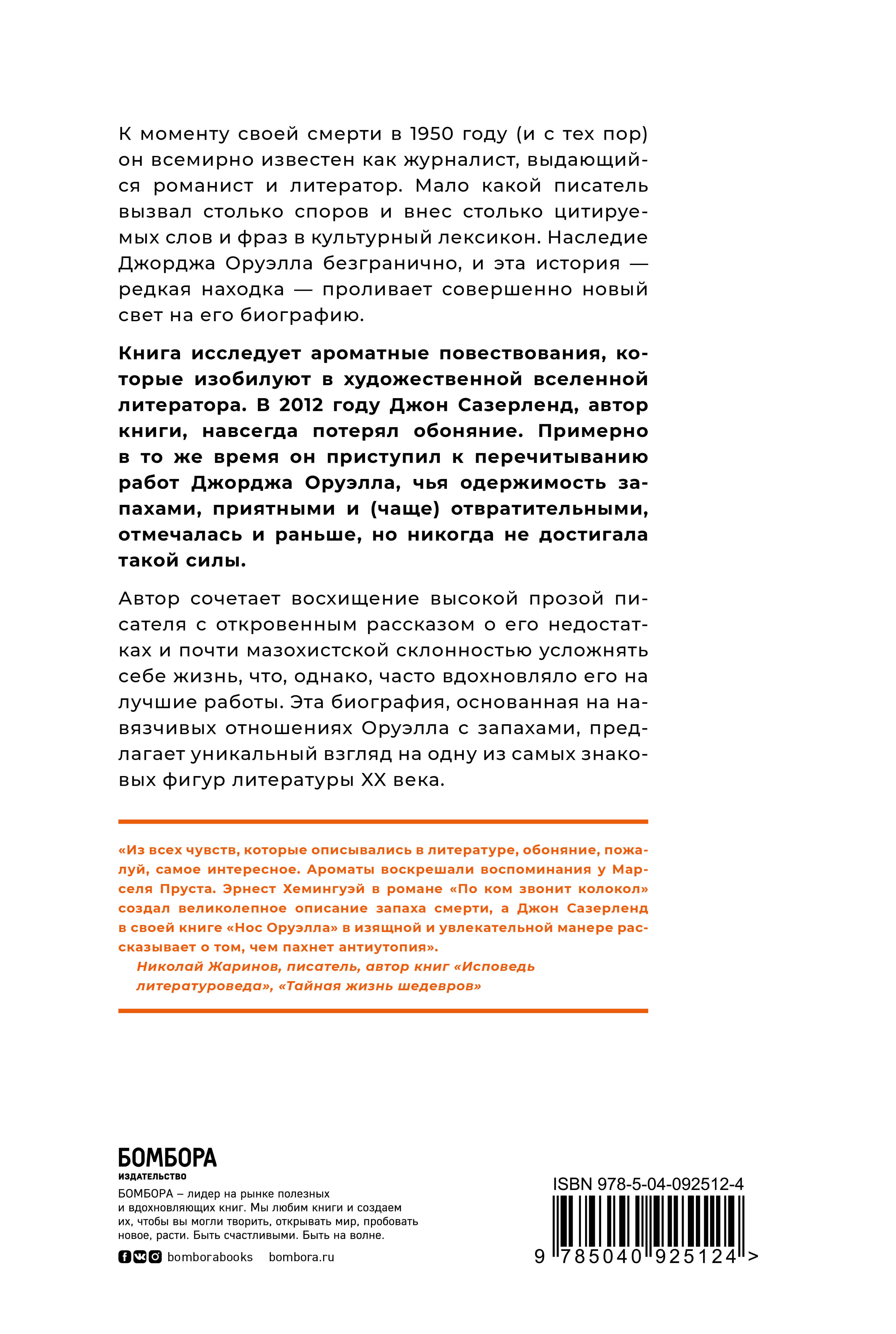 «Вам принесли кофе в постель. Вы схватили его. Он был горячим. Вы почувствовали это. Однако у него не было запаха. Когда вы сделали глоток, под нёбо лилась только горячая вода», - такой сюжет идеально подошел бы для жанра антиутопии, если бы не был частью сегодняшнего дня. Что значат для нас запахи? Легко ли жить в мире, в котором ничего больше не пахнет? Однажды Джон Сазерленд, автор этой книги, навсегда потерял обоняние. Примерно в то же время он начал перечитывать Джорджа Оруэлла и заметил кое-что странное: Оруэлл был явно одержим запахами. Эта одержимость приятными и (чаще) отвратительными запахами отмечалась и ранее, но никогда еще не была исследована в такой степени. Сазерленд сочетает восхищение «идеальной прозой» Оруэлла с откровенным разоблачением его недостатков как человека и его почти мазохистской склонностью усложнять себе жизнь, что, однако, часто вдохновляло его на лучшие работы. В этой оригинальной, непочтительной биографии Сазерленд предлагает свежий рассказ о жизни и творчестве Оруэлла, в котором чувствуется уникальный «ароматный» след и обогащающий взгляд на одного из самых важных писателей XX века.