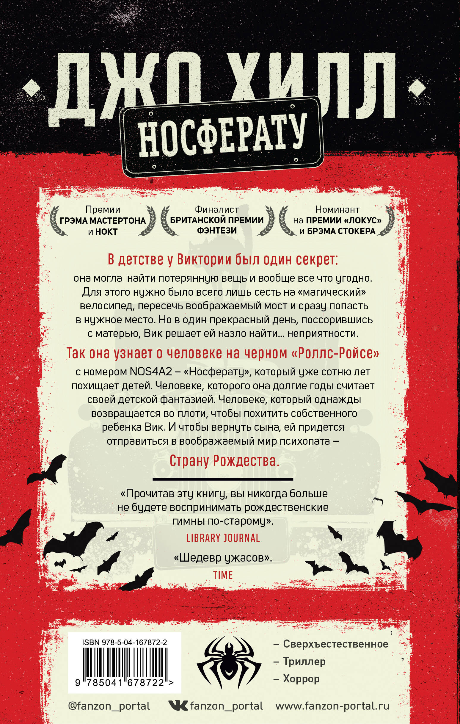 Премия Лорда Рутвена - за роман о вампирах. Премия Грэма Мастертона - за роман из США. Премия Нокт - лучшая зарубежная книга. Финалист Британской премии фэнтези - премия Августа Дерлета за лучший хоррор. Номинант на премию «Локус» - роман фэнтези. Финалист премии Брэма Стокера - лучший роман ужасов. «Носферату» - это захватывающий мистический роман о сверхъестественном от мастера ужасов Джо Хилла, автора бестселлеров по версии New York Times «Коробка в форме сердца», «Черный телефон» и «Рога». Виктория Маккуин обладает тайным даром находить вещи: потерянный браслет, пропавшую фотографию, ответы на вопросы, на которые нет ответов. На своем велосипеде «Роли Тафф Бернер» она добирается до шаткого крытого моста, который через мгновения переносит ее туда, куда ей нужно - будь то через Массачусетс или через всю страну. Чарльз Талант Мэнкс умеет обращаться с детьми. Он любит катать их на своем «Роллс-Ройс Призрак» 1938 года выпуска с номерным знаком NOS4A2. В нем он может проскользнуть из повседневного мира на скрытые дороги, которые ведут в удивительную - и ужасающую - Страну Рождества. В один прекрасный день Вик отправляется на поиски неприятностей - и находит Мэнкса. Это было целую жизнь назад. Теперь Вик, единственный ребенок, сбежавший от серийного похитителя, выросла и отчаянно хочет забыть о прошлом. Но Чарли Мэнкс никогда не переставал думать о Виктории Маккуин. Он снова в пути. Он снова подобрал пассажира - собственного сына Вик. «Шедевр ужасов». - Time «Одна из лучших книг в жанре за последние годы». - Fantlab «Прочитав эту книгу, вы никогда больше не будете воспринимать рождественские гимны по-старому». - Library Journal «Новый взгляд на жанр фэнтези-хоррор». - The Sun Herold «NOS4A2 - это блестящее исследование классических и современных монстров и темных фантазий, все смонтировано, перестроено и тюнинговано... Благодаря этому роману, захватывающему от начала до конца, Джо Хилл становится настоящим мастером своего дела». - Publishers Weekly «К чтению строго рекомендуется». - Horrorzone| Издательство | Эксмо |