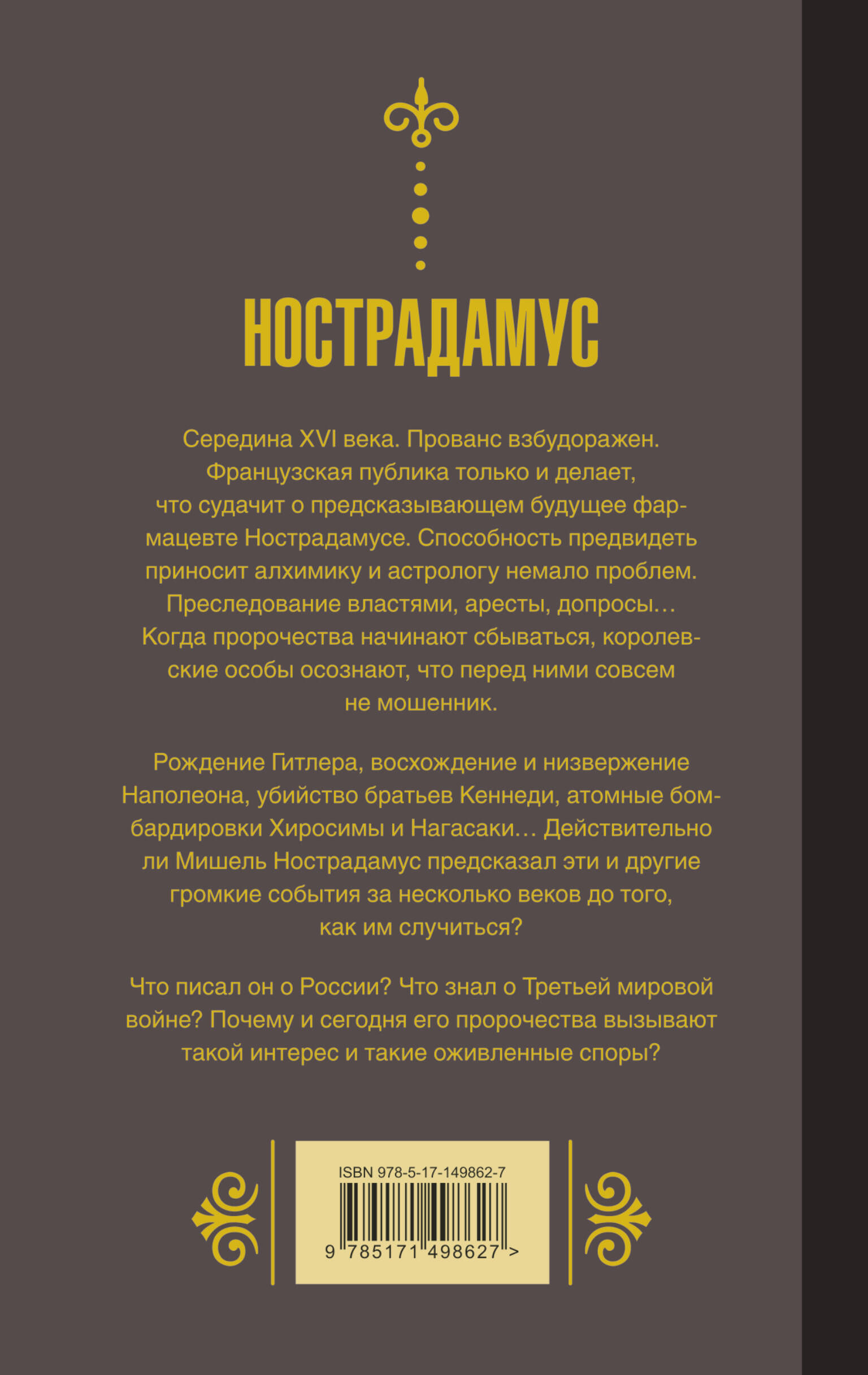 Желание людей заглянуть в будущее актуально во все века! В книгу вошли предсказания легендарного французского алхимика с толкованиями и соответствующими историческими справками. Читатели погрузятся в захватывающий и таинственный мир расплывчатых образов, туманных формулировок и волнительного ожидания грядущих событий, которые удалось предвидеть Нострадамусу за столетия до их прихода.| Издательство | АСТ |