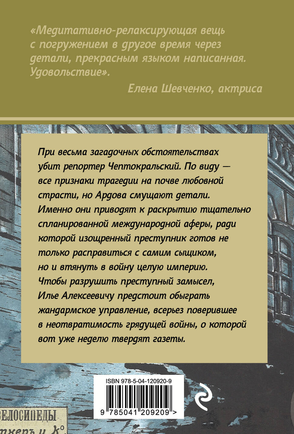 Сыщик Илья Ардов - главный герой серии ретро-детективов. Илья Алексеевич обладает уникальной способностью помнить всё, что когда-либо видел, слышал или читал. При помощи своего друга, криминалиста Жаркова, молодому сыщику удается изобрести собственный метод расследования, основанный на способности мысленно возвращаться на место преступления, чтобы обнаружить незамеченные ранее улики. Это умение в короткий срок делает Ардова звездой криминального сыска Санкт-Петербурга конца XIX века. При весьма загадочных обстоятельствах убит репортер Чептокральский. По виду - все признаки трагедии на почве любовной страсти, но Ардова смущают детали. Именно они приводят к раскрытию тщательно спланированной международной аферы, ради которой изощренный преступник готов не только расправиться с самим сыщиком, но и втянуть в войну целую империю. Чтобы разрушить преступный замысел, Илье Алексеевичу предстоит обыграть жандармское управление, всерьез поверившее в неотвратимость грядущей войны, о которой вот уже неделю твердят газеты. «Медитативно-релаксирующая вещь с погружением в другое время через детали, прекрасным языком написанная. Удовольствие». - Елена Шевченко, актриса| Издательство | ООО "Издательство "Эксмо" |