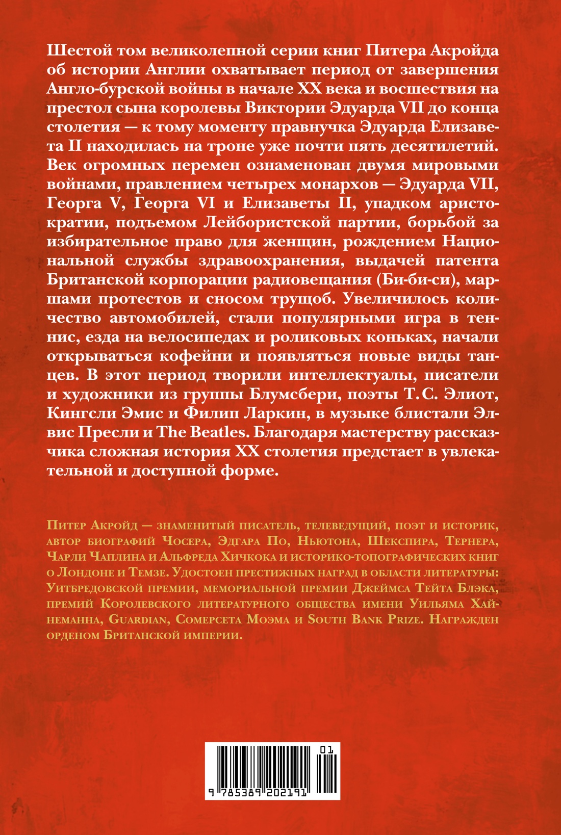 История Англии - это непрерывное движение и череда постоянных изменений. Но всю историю Англии начиная с первобытности пронизывает преемственность, так что главное в ней - не изменения, а постоянство. До сих пор в Англии чувствуется неразрывная связь с прошлым, с традициями и обычаями. До сих пор эта страна сопротивляется изменениям в любом аспекте жизни. Питер Акройд показывает истоки вековой неизменности Англии, ее консерватизма и приверженности прошлому. В этом томе события истории Англии берут отсчет с 1902 года, когда завершилась Англо-бурская война, в ходе которой тех, кто раньше испытывал гордость за империю, постепенно охватывали разочарование и стыд. Эдуард VII, хоть и не дотягивал по политическому весу до своей матери, королевы Виктории, был самым любимым в народе английским королем после Карла II. При его сыне Георге V страна участвовала в Первой мировой войне и еще сохраняла некоторые черты викторианского времени, но к концу правления следующего монарха она изменилась до неузнаваемости. Георг VI вступил на престол после отречения Эдуарда VIII, своего старшего брата, и стал одним из символов борьбы против Германии и нацизма во время Второй мировой войны. Он был последним императором Индии и последним королем Ирландии: Британская империя распалась и произошло ее преобразование в Содружество наций. После смерти монарха и коронации его дочери началась новая Елизаветинская эпоха. К рубежу тысячелетий, до которого доходит повествование, за время правления Елизаветы II сменилось десять премьер-министров, самыми известными из которых стали Уинстон Черчилль, Гарольд Вильсон, Маргарет Тэтчер и Тони Блэр. Завершается великолепная серия книг знаменитого британского автора, но история Англии продолжает ход.