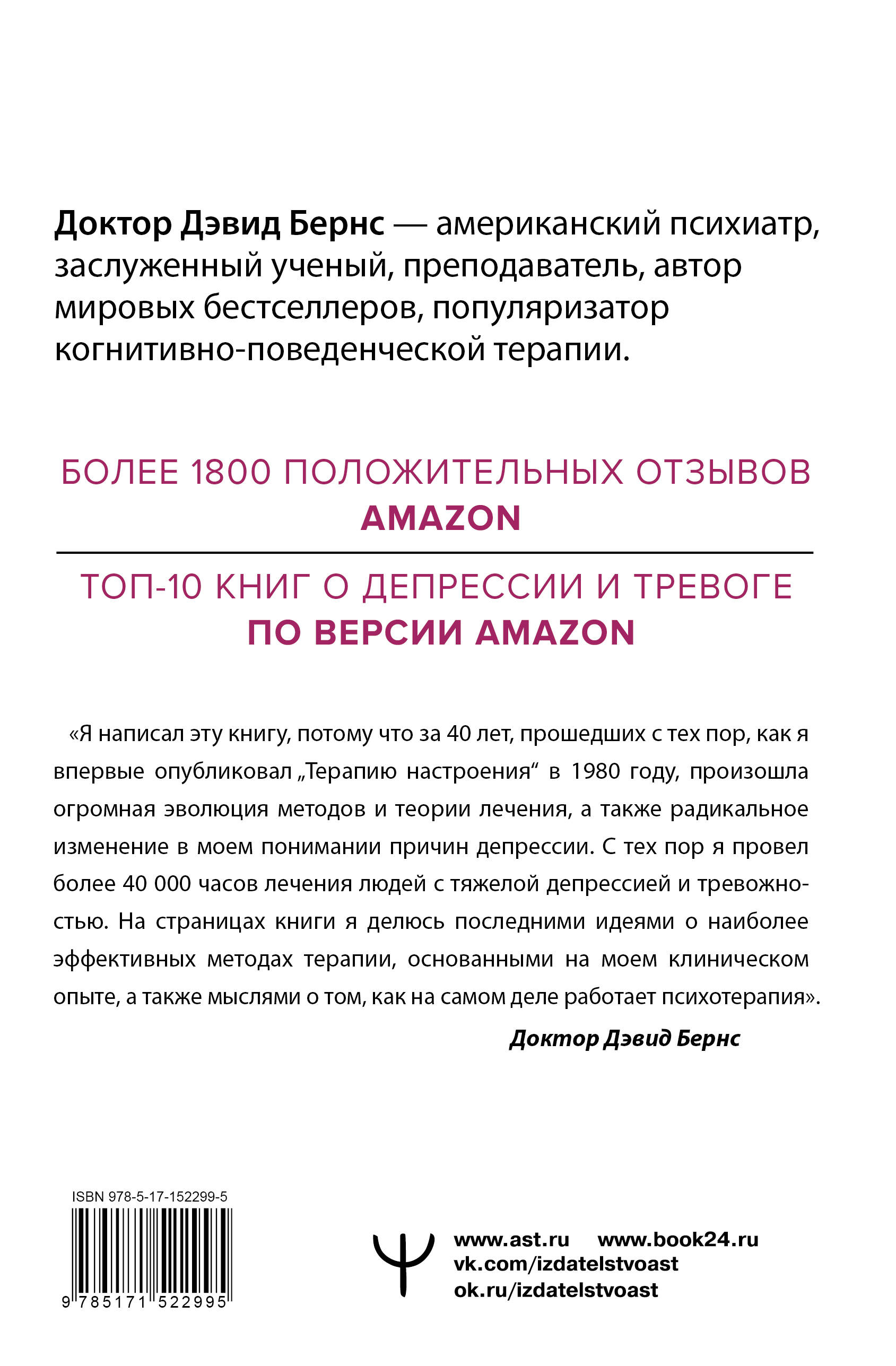 Страдаете от плохого настроения, тревоги, одиночества, сомнений в себе и низкой самооценки? Есть способ справиться с этим без дорогостоящих консультаций и медикаментов! Перед вами книга одного из самых знаменитых психиатров современности - доктора Дэвида Бернса. Первая версия книги была переведена на 20 языков и с 1980 года продана тиражом более пяти миллионов экземпляров по всему миру. Пришло время обновленной версии. • ТОП-10 Amazon в разделах "Депрессия", "Тревога", "Расстройства настроения". Более 1800 положительных отзывов. • TEAM-терапия - новый революционный метод борьбы с депрессией, тревогой, фобиями и плохим настроением. • Более 50 эффективных терапевтических техник. • Результаты 40-летних исследований и более чем 40 000 часов лечения людей. • Классика когнитивно-поведенческой терапии.| Издательство | ИЗДАТЕЛЬСТВО "АСТ" |