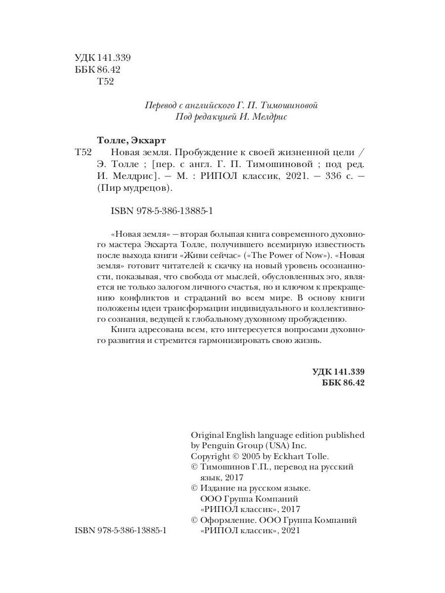 «Новая земля» - вторая большая книга современного духовного мастера Экхарта Толле, получившего всемирную известность после выхода книги «Живи сейчас» («The Power of Now»). «Новая земля» готовит читателей к скачку на новый уровень осознанности, показывая, что свобода от мыслей, обусловленных эго, является не только залогом личного счастья, но и ключом к прекращению конфликтов и страданий во всем мире. В основу книги положены идеи трансформации индивидуального и коллективного сознания, ведущей к глобальному духовному пробуждению. Книга адресована всем, кто интересуется вопросами духовного развития и стремится гармонизировать свою жизнь.| Издательство | Рипол Классик |