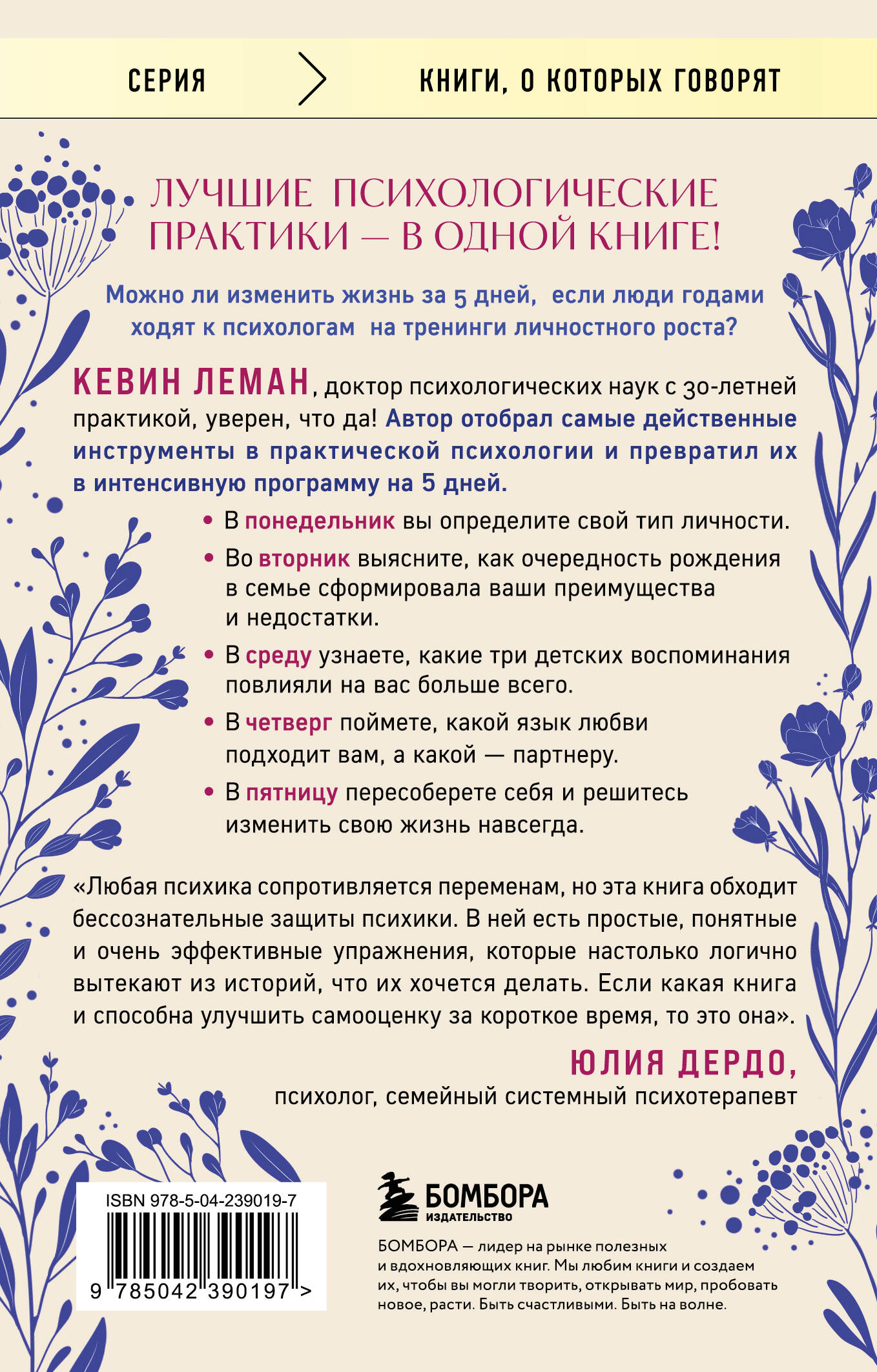 ЛУЧШИЕ ПСИХОЛОГИЧЕСКИЕ ПРАКТИКИ - В ОДНОЙ КНИГЕ! Можно ли изменить жизнь за 5 дней, если люди годами ходят к психологам и на тренинги личностного роста? Кевин Леман, доктор психологических наук с 30-летней практикой, уверен, что да! Для тех, кому кажется, что жизнь не дотягивает до мечты, или тем, кто часто придерживается принципа «не пробовал - не стоит и начинать», автор отобрал самые действенные инструменты в практической психологии и превратил их в интенсивную программу на 5 дней. В понедельник вы определите свой тип личности. Во вторник выясните, как очередность рождения в семье сформировала ваши преимущества и недостатки. В среду узнаете, какие три детских воспоминания повлияли на вас больше всего. В четверг поймете, какой язык любви подходит вам, а какой - партнеру. В пятницу пересоберете себя и решитесь изменить свою жизнь навсегда. ОТЗЫВ: «Можно нагуглить миллион упражнений для поднятия самооценки, но мы этого не делаем. Потому что любая психика сопротивляется переменам. Но эта книга обходит бессознательные защиты психики. Она наполнена историями, читая которые, сам не замечаешь, как меняешься. В ней есть простые, понятные и очень эффективные упражнения, которые настолько логично вытекают из историй, что их хочется делать. Если какая книга и способна улучшить самооценку за короткое время, то это она». - Юлия Дердо, психолог, семейный системный психотерапевт| Издательство | ООО "Издательство "Эксмо" |