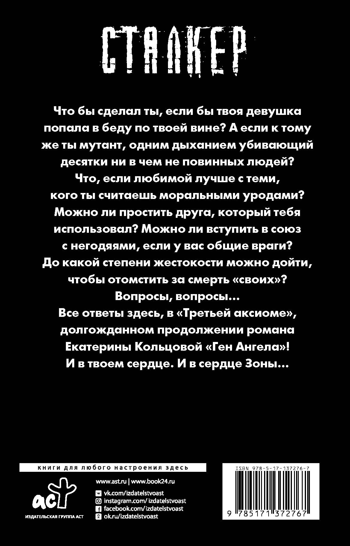 Что бы сделал ты, если бы твоя девушка попала в беду по твоей вине? А если к тому же ты мутант, одним дыханием убивающий десятки ни в чем не повинных людей? Что, если любимой лучше с теми, кого ты считаешь моральными уродами? Можно ли простить друга, который тебя использовал? Можно ли вступить в союз с негодяями, если у вас общие враги? До какой степени жестокости можно дойти, чтобы отомстить за смерть "своих"? Вопросы, вопросы… Все ответы здесь, в "Третьей аксиоме", долгожданном продолжении романа Екатерины Кольцовой "Ген Ангела"! И в твоем сердце. И в сердце Зоны…| Издательство | ИЗДАТЕЛЬСТВО "АСТ" |