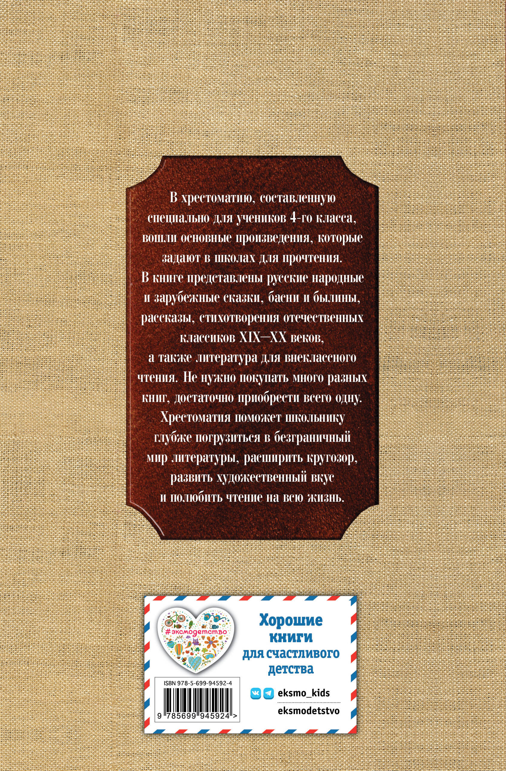 Это уникальное издание, составленное специально для будущих четвероклассников. Хрестоматия содержит произведения, которые входят в список школьной литературы на лето большинства школ, и может быть использована со всеми рекомендованными учебниками. В состав хрестоматии вошло устное народное творчество, а также русская и зарубежная классика XIX-XX веков. В книге можно найти все необходимые произведения, такие как «Няне» и «Туча» Пушкина, «Детство» Гумилева, «Русалочка» и «Оле-Лукойе» Андерсена, «Приключения Барона Мюнхгаузена» Распе и другие, и вам не придется покупать много разных книг. Хрестоматия направлена на то, чтобы привить ученику любовь к чтению, расширить его кругозор, развить его логику, мышление, речь с помощью интересных вопросов. Кроме того, книга имеет очень удобный формат - ее можно взять с собой на прогулку, на дачу или на отдых.| Издательство | ООО "Издательство "Эксмо" |