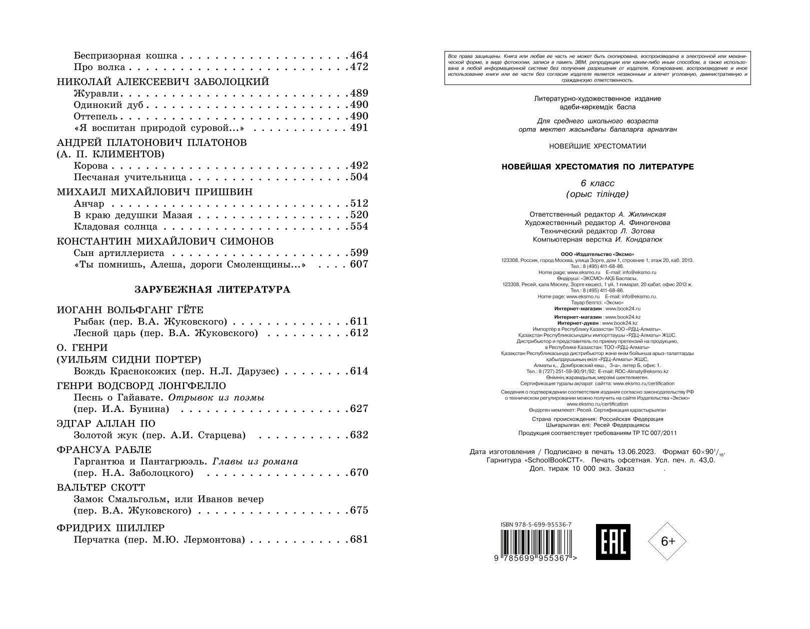 Хрестоматия для 6-го класса содержит произведения, которые входят в список школьной литературы на лето большинства школ, и может быть использована со всеми рекомендованными учебниками. В состав хрестоматии вошло устное народное творчество, а также русская и зарубежная классика XIX-XX веков. В книге можно найти все необходимые произведения, такие как «Кладовая солнца», «Песнь о Вещем Олеге», «Детство» и другие, и вам не придется покупать много разных книг. Хрестоматия направлена на то, чтобы привить ученику любовь к чтению, расширить его кругозор, развить его логику, мышление, речь с помощью интересных вопросов. Кроме того, книга имеет очень удобный формат - ее можно взять с собой на прогулку, на дачу или на отдых.| Издательство | Эксмо |