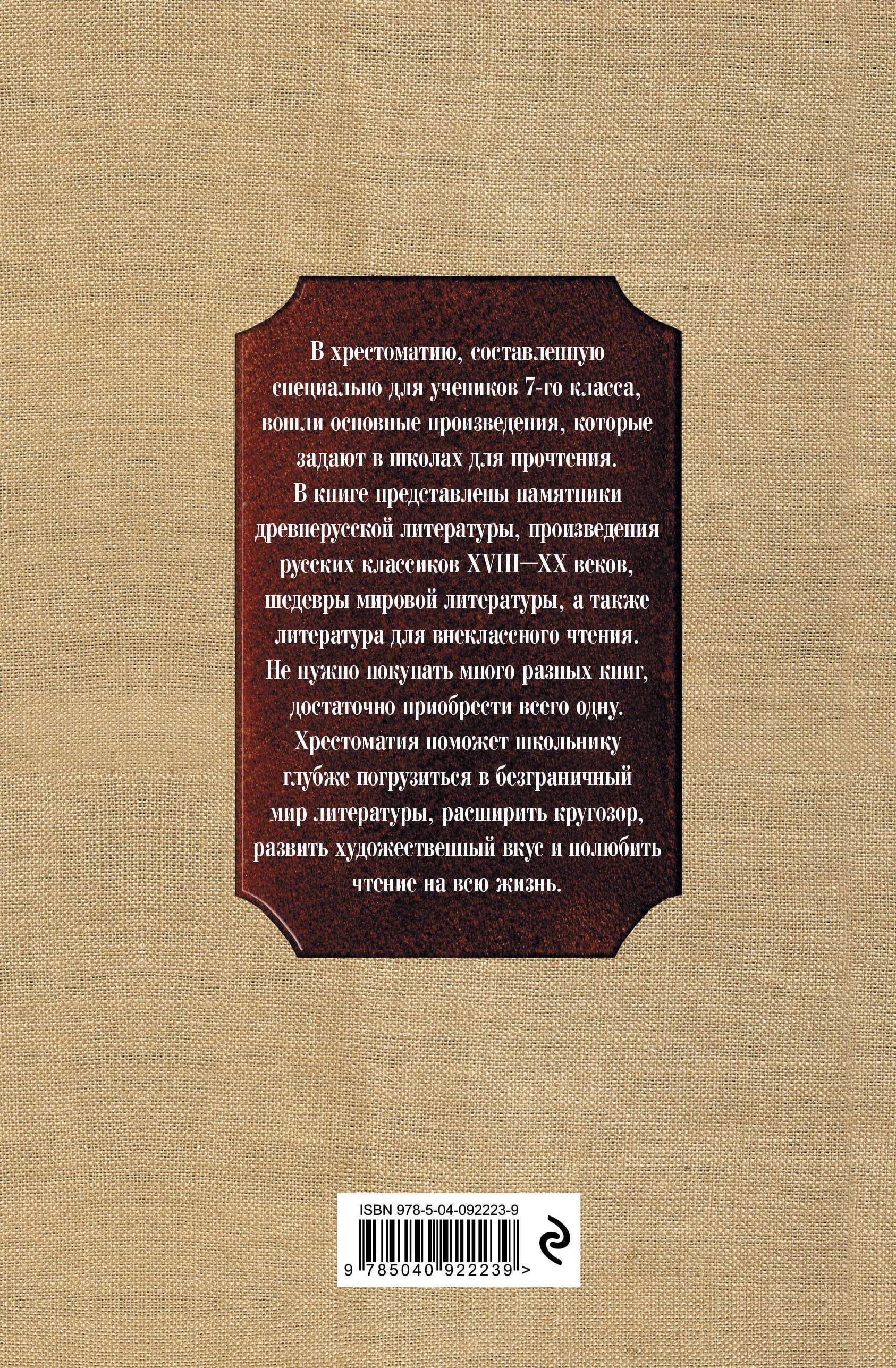 Хрестоматия для 7 класса содержит произведения, которые входят в список школьной литературы на лето большинства школ, и может быть использована со всеми рекомендованными учебниками. В состав хрестоматии вошли русская и зарубежная классика XIX-XX веков. В книге можно найти все необходимые произведения, такие как «Мцыри» и «Смерть поэта» Лермонтова, «Станционный смотритель» и «Медный всадник» Пушкина, древнерусская литература и другие, и вам не придется покупать много разных книг. Хрестоматия направлена на то, чтобы привить ученику любовь к чтению, расширить его кругозор, развить его логику, мышление, речь с помощью интересных вопросов. Кроме того, книга имеет очень удобный формат - ее можно взять с собой на прогулку, на дачу или на отдых.| Издательство | Эксмо |