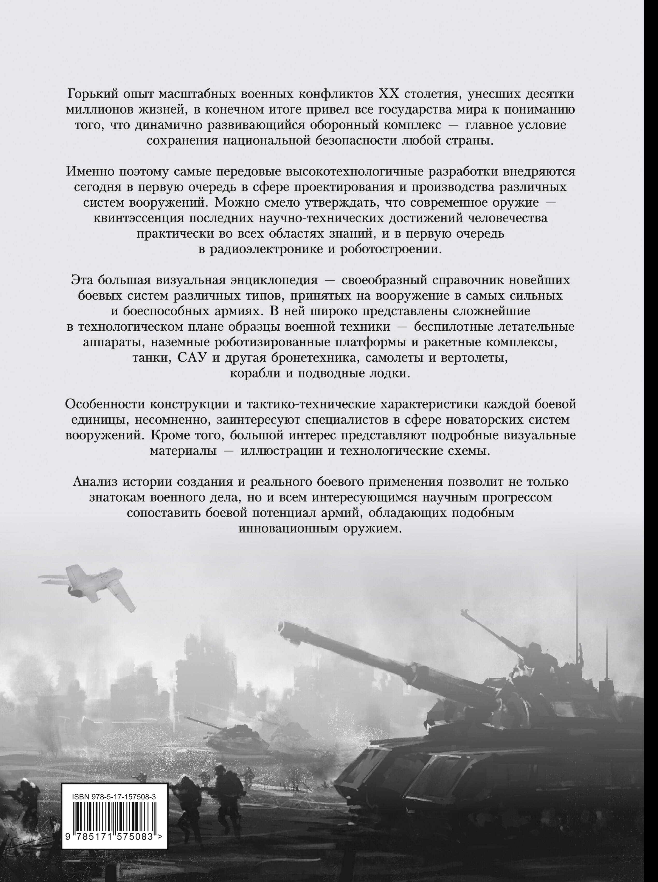 Эта большая визуальная энциклопедия - своеобразный справочник новейших боевых систем различных типов, принятых на вооружение в самых сильных и боеспособных армиях. В ней широко представлены сложнейшие в технологическом плане образцы военной техники - беспилотные летательные аппараты, наземные роботизированные платформы и ракетные комплексы, танки, САУ и другая бронетехника, самолеты и вертолеты, корабли и подводные лодки. Особенности конструкции и тактико-технические характеристики каждой боевой единицы, несомненно, заинтересуют специалистов в сфере новаторских систем вооружений. Кроме того, большой интерес представляют подробные визуальные материалы - иллюстрации и технологические схемы. Анализ истории создания и реального боевого применения позволит не только знатокам военного дела, но и всем интересующимся научным прогрессом сопоставить боевой потенциал армий, обладающих подобным инновационным оружием.| Издательство | Издательство "АСТ" |