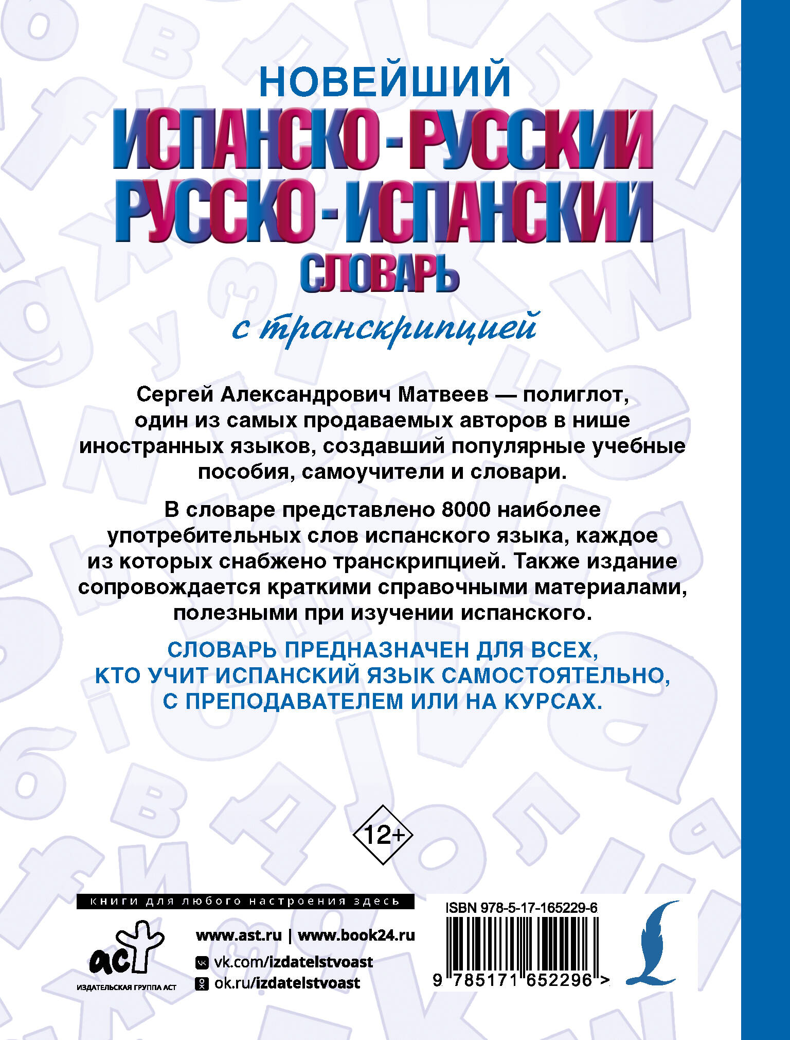 Сергей Александрович Матвеев - один из самых продаваемых авторов в нише иностранных языков, создавший популярные учебные пособия, самоучители и словари. Настоящий словарь разделен на испанско-русскую и русско-испанскую части, которые вместе содержат около 8000 слов. Все слова в обеих частях сопровождаются транскрипцией. В конце издания находится справочная информация, которая будет полезна при изучении испанского языка. Словарь подходит всем, кто изучает испанский язык самостоятельно, с преподавателем или на курсах.| Издательство | Издательство "АСТ" |