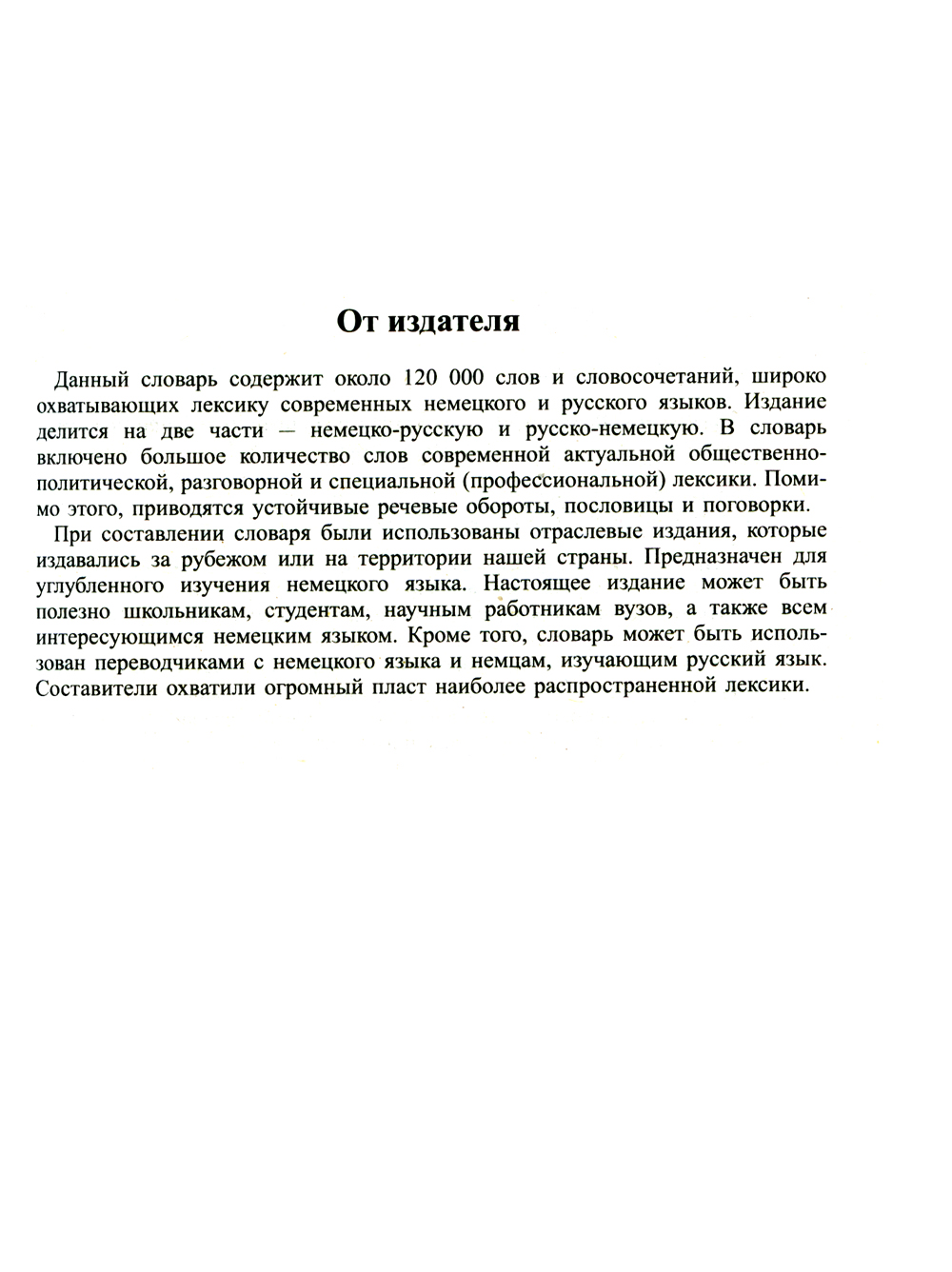 Данное издание содержит около 120 000 слов, словосочетаний и выражений, широко охватывающих лексику современных немецкого и русского языков. В словаре широко представлены наиболее употребимые слова общественно-политической, специальной сленговой и разговорной лексики. Также приводится большое количество устойчивых оборотов речи, пословиц и поговорок. Настоящее издание может быть полезным школьникам, преподавателям, студентам, изучающим немецкий язык, а также немцам, изучающим русский язык.| Издательство | Дом славянской книги |