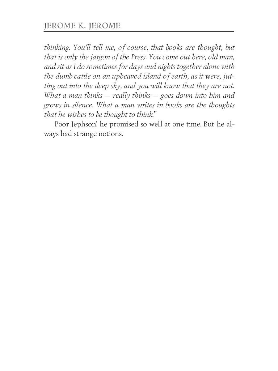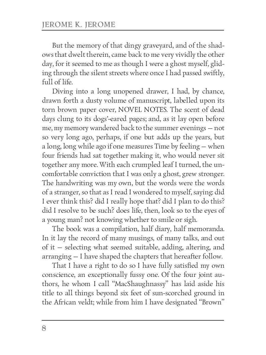 Jerome Klapka Jerome (1859 -1927) was an English writer and humourist. The author sets himself a Herculean task, as main character in his own novel: to fictionally compose another novel, in collaboration with a trio of his pipe-party bachelor friends: Jephson, Brown, and MacShaughnassy.