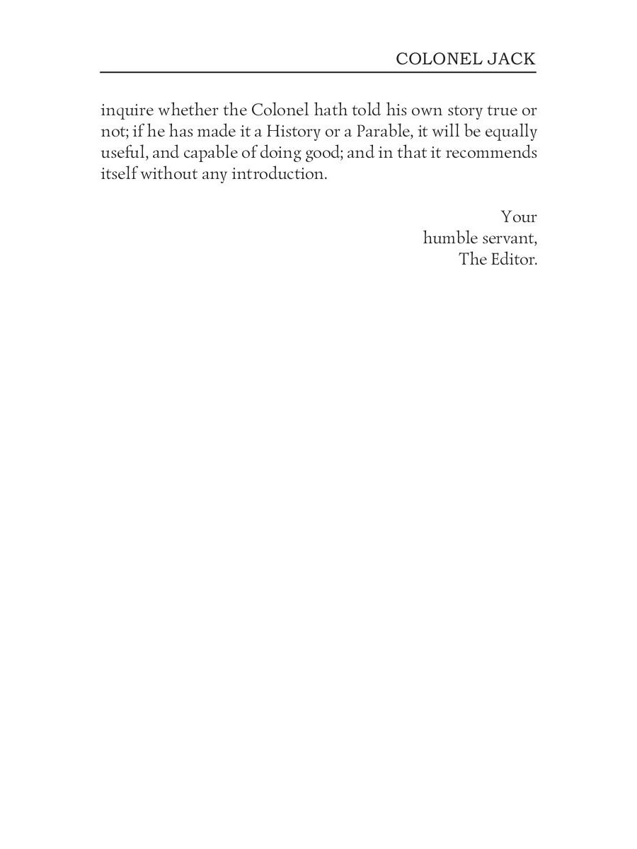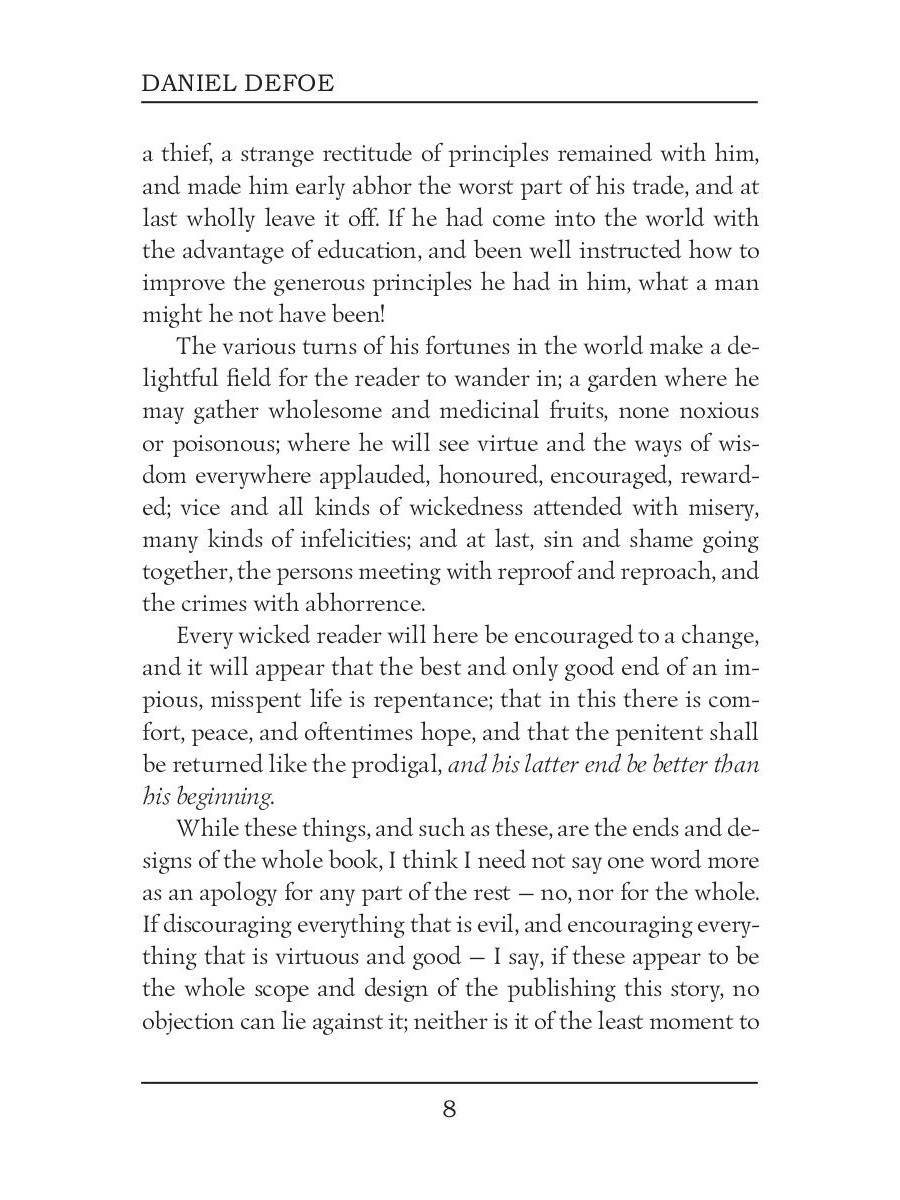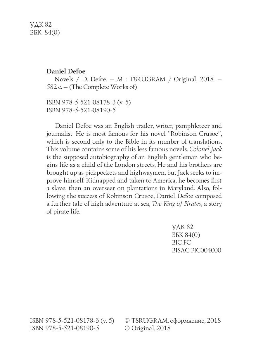 Daniel Defoe was an English trader, writer, pamphleteer and journalist. He is most famous for his novel "Robinson Crusoe", which is second only to the Bible in its number of translations. This volume contains some of his less famous novels. Colonel Jack is the supposed autobiography of an English gentleman who begins life as a child of the London streets. He and his brothers are brought up as pickpockets and highwaymen, but Jack seeks to improve himself. Kidnapped and taken to America, he becomes first a slave, then an overseer on plantations in Maryland. Also, following the success of Robinson Crusoe, Daniel Defoe composed a further tale of high adventure at sea, The King of Pirates, a story of pirate life.