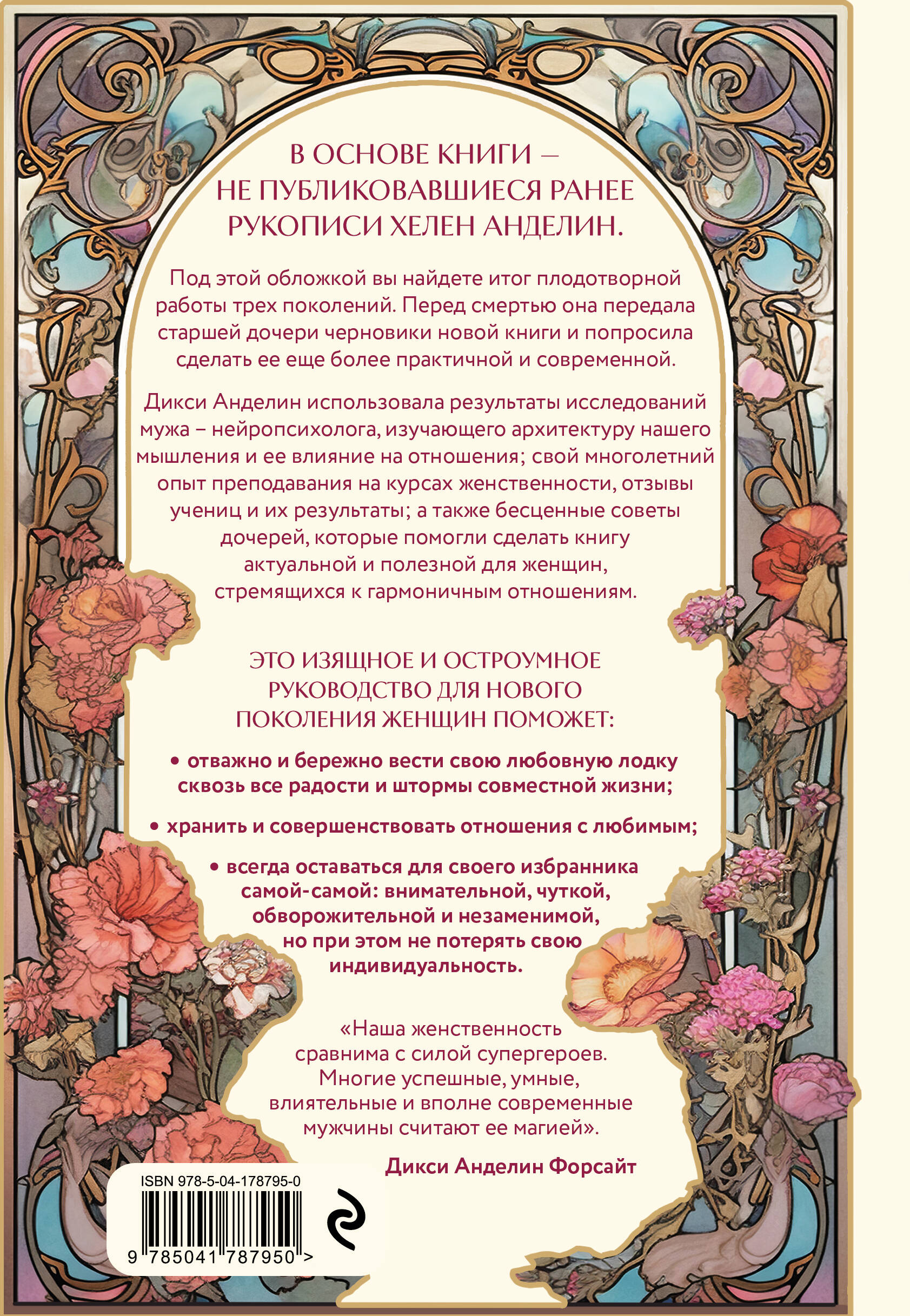 В ОСНОВЕ КНИГИ - НЕ ПУБЛИКОВАВШИЕСЯ РАНЕЕ РУКОПИСИ ХЕЛЕН АНДЕЛИН и исследования по нейропсихологии, которые помогут вам построить с мужчиной прочные и доверительные отношения. Эта книга - итог труда трех поколений семьи Хелен Анделин. Перед смертью она передала старшей дочери черновики новой книги и попросила сделать ее еще более практичной и современной. Дикси Анделин использовала результаты исследований мужа - нейропсихолога, изучающего архитектуру нашего мышления и ее влияние на отношения; свой многолетний опыт преподавания на курсах женственности, отзывы учениц и их результаты; а также бесценные советы дочерей, которые помогли сделать книгу актуальной и полезной для женщин, стремящихся к гармоничным отношениям. Это изящное и остроумное руководство поможет каждой женщине: - отважно и бережно вести свою любовную лодку сквозь все радости и штормы совместной жизни; - хранить и совершенствовать отношения с любимым; - всегда оставаться для своего избранника самой-самой: внимательной, чуткой, обворожительной и незаменимой, но при этом не потерять свою индивидуальность. «Наша женственность сравнима с силой супергероев. Многие успешные, умные, влиятельные и вполне современные мужчины считают ее магией». - Дикси Анделин Форсайт| Издательство | ООО "Издательство "Эксмо" |